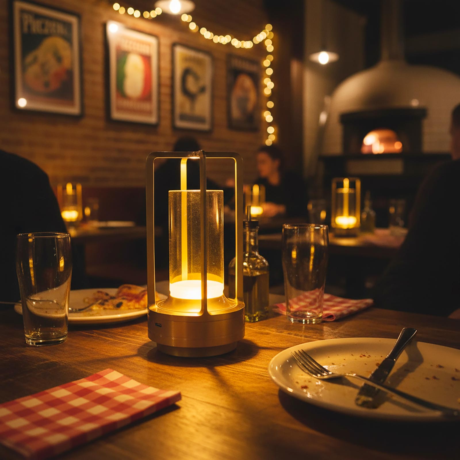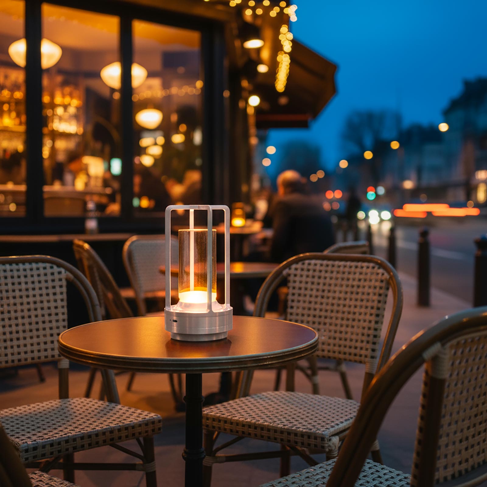 Lampada da tavolo ricaricabile senza fili, progettata per creare una piacevole luce d’atmosfera su tavoli e tavolini di bar, pub, ristoranti, pizzerie o in ambienti domestici come salotti, camere da letto e uffici.