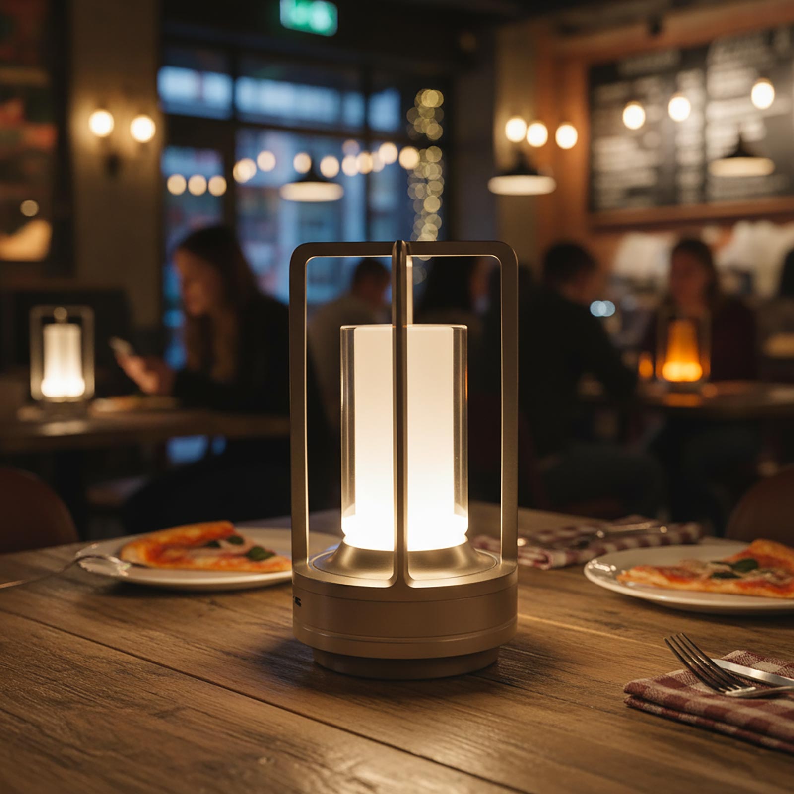 Lampada da tavolo ricaricabile senza fili, progettata per creare una piacevole luce d’atmosfera su tavoli e tavolini di bar, pub, ristoranti, pizzerie o in ambienti domestici come salotti, camere da letto e uffici.