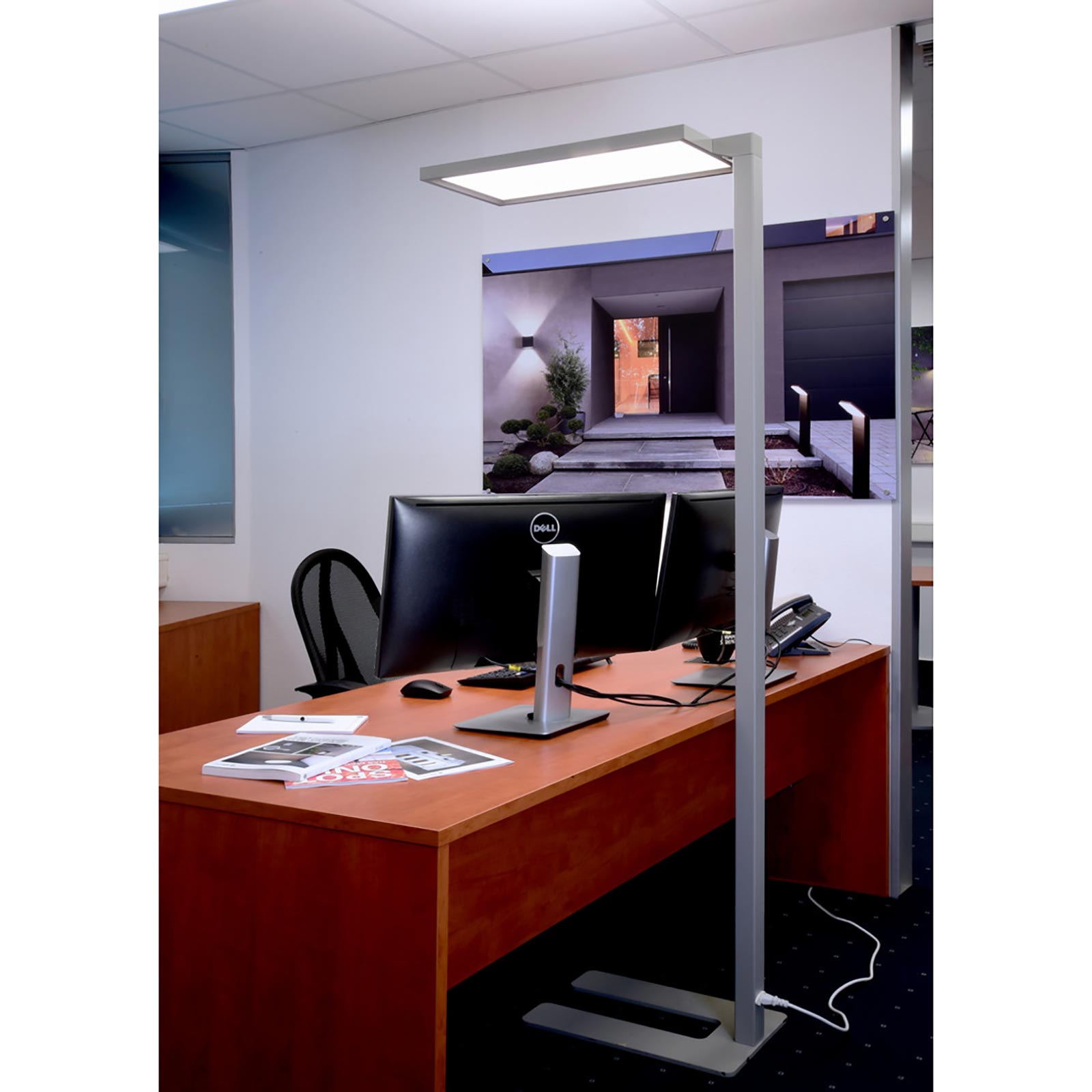 Elegante e funzionale piantana modera da ufficio dotata di sensore sensore touch realizzata in alluminio di colore grigio ideale per l'illuminazione interna in ambito lavorativo di uffici, studi medici, studi commerciali, utile per ottenere un confort luminoso nei propri ambienti di lavoro. Dotata di diffusore trasparente integra LED ad alta efficienza energetica con una potenza di 55W.