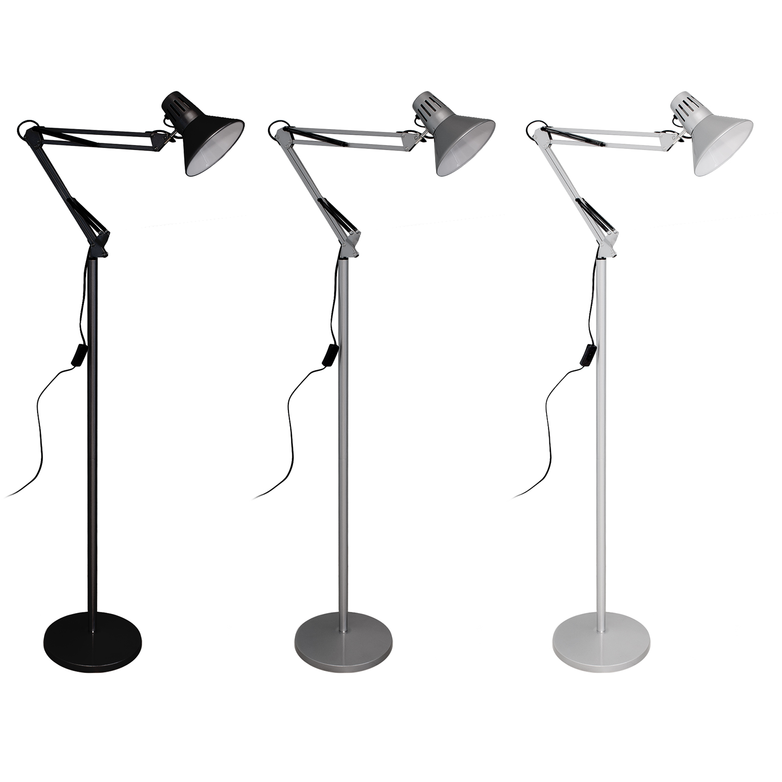 Classica lampada da terra con braccio regolabile dotata di diffusore con portalampada E27 compatibile con la maggior parte di lampade e lampadine LED con attacco E27. Adatta in abienti interni per l'illuminazione di scrivanie di uffici, scrivanie di camerette, studi medici, laboratori tecnici, come lampada per la lettura ed in tutti quei posti dove si vuole una fonte luminosa versatile.