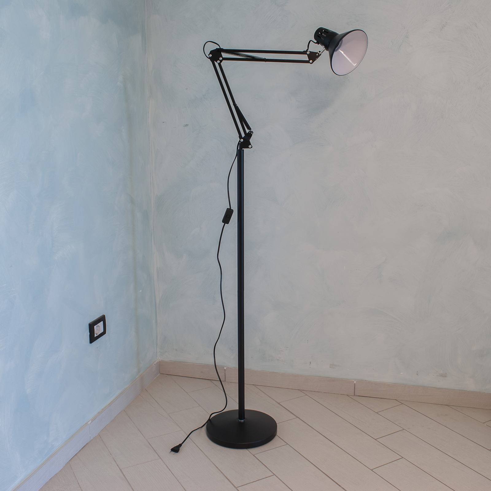 Classica lampada da terra con braccio regolabile dotata di diffusore con portalampada E27 compatibile con la maggior parte di lampade e lampadine LED con attacco E27. Adatta in abienti interni per l'illuminazione di scrivanie di uffici, scrivanie di camerette, studi medici, laboratori tecnici, come lampada per la lettura ed in tutti quei posti dove si vuole una fonte luminosa versatile.