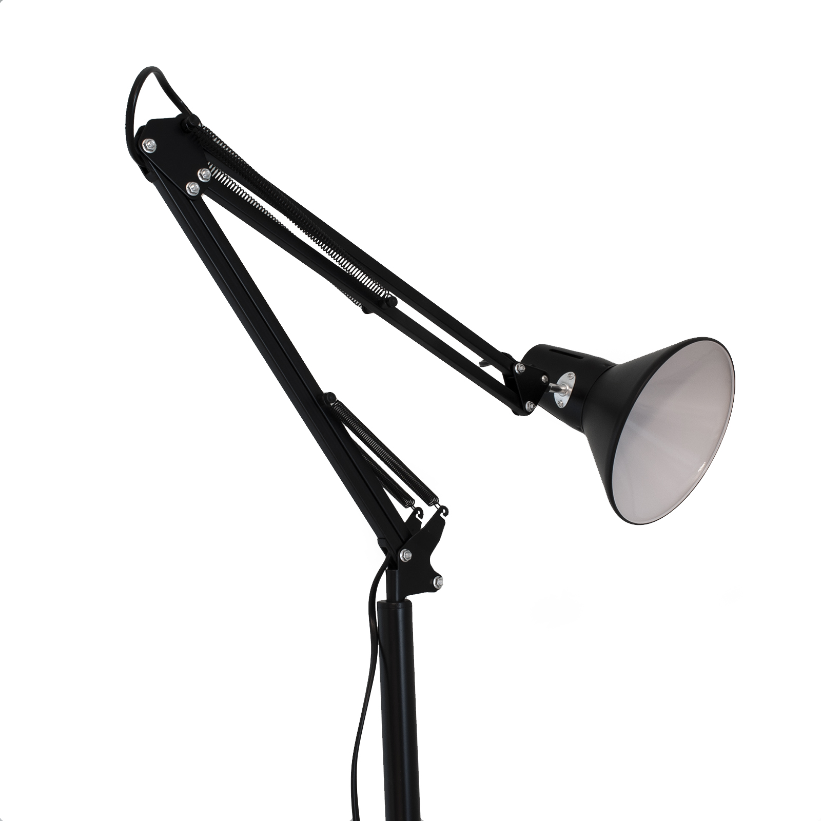 Classica lampada da terra con braccio regolabile dotata di diffusore con portalampada E27 compatibile con la maggior parte di lampade e lampadine LED con attacco E27. Adatta in abienti interni per l'illuminazione di scrivanie di uffici, scrivanie di camerette, studi medici, laboratori tecnici, come lampada per la lettura ed in tutti quei posti dove si vuole una fonte luminosa versatile.
