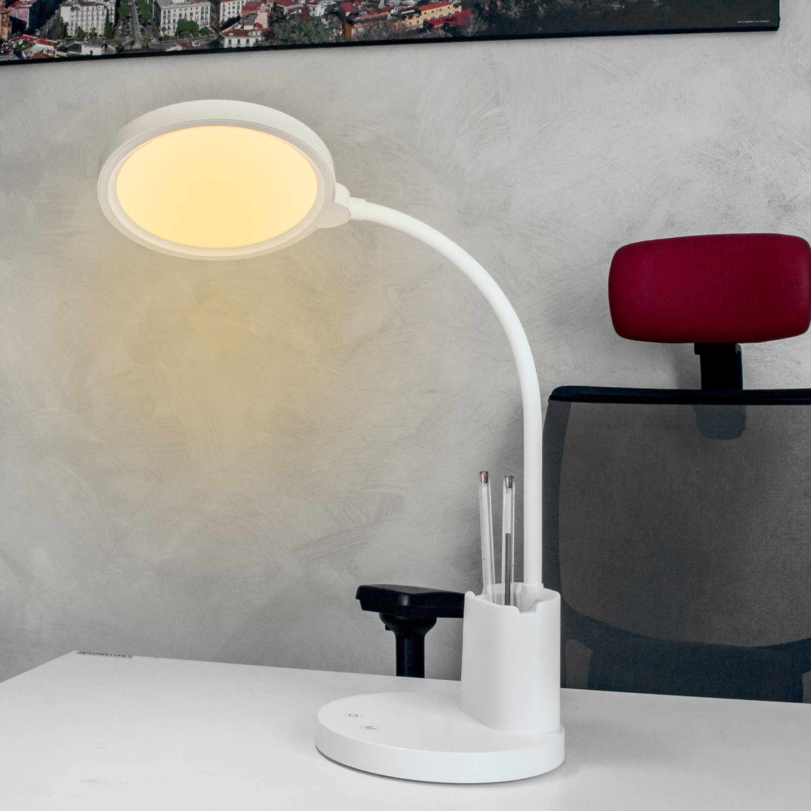 Elegante lampada da tavolo 3 step senza fili con batteria interna ricaricabile ideale per illuminare scrivanie di uffici, tavoli da lavoro, scivanie di camerette, realizzata in plastica di colore bianco integra LED con potenza 8W dotata di braccio flessibile per direzionare la luce secondo le proprie esigenze. Questa lampada ha la particolarità di emettere 3 notalità di luce 3000K (luce calda) 4000K (luce naturale) 6500K (luce fredda) tutto in un unico prodotto, inoltre è dotata di memoria interna che ricorda l'ultima temperatura di luce impostata.