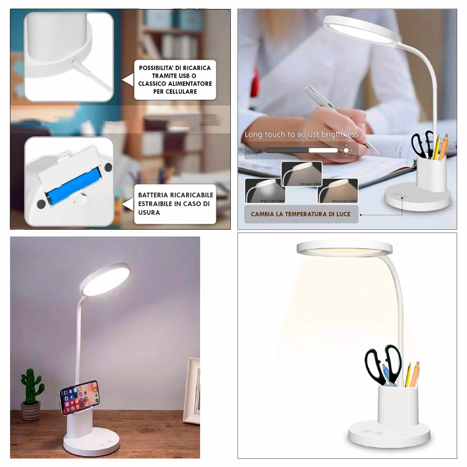 Ed ancora questa particolare lampada è dotata vano porta penne e di supporto per il cellulare, abbiamo così la possibilità di avere in un unico prodotto una lampada da tavolo ed un comodo supporto per cellulare.
