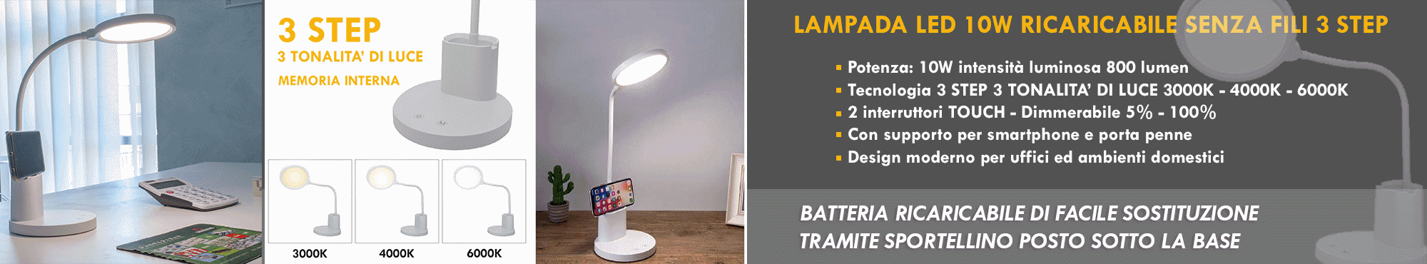 Elegante lampada da tavolo 3 step senza fili con batteria interna ricaricabile ideale per illuminare scrivanie di uffici, tavoli da lavoro, scivanie di camerette, realizzata in plastica di colore bianco integra LED con potenza 8W dotata di braccio flessibile per direzionare la luce secondo le proprie esigenze. Questa lampada ha la particolarità di emettere 3 notalità di luce 3000K (luce calda) 4000K (luce naturale) 6500K (luce fredda) tutto in un unico prodotto, inoltre è dotata di memoria interna che ricorda l'ultima temperatura di luce impostata.