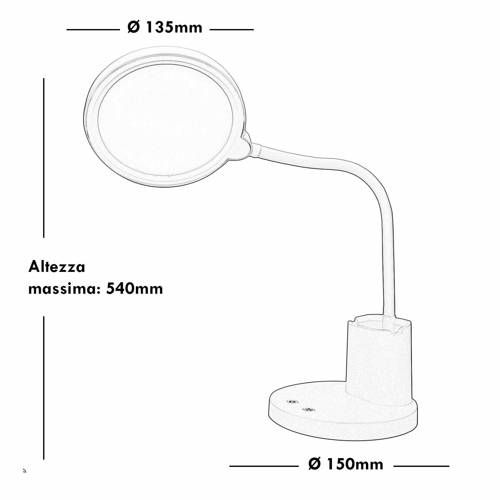 Dimensioni: Altezza massima del braccio flessibile 540mm - Diametro del diffusore: 135mm - Diametro della base: 155mm