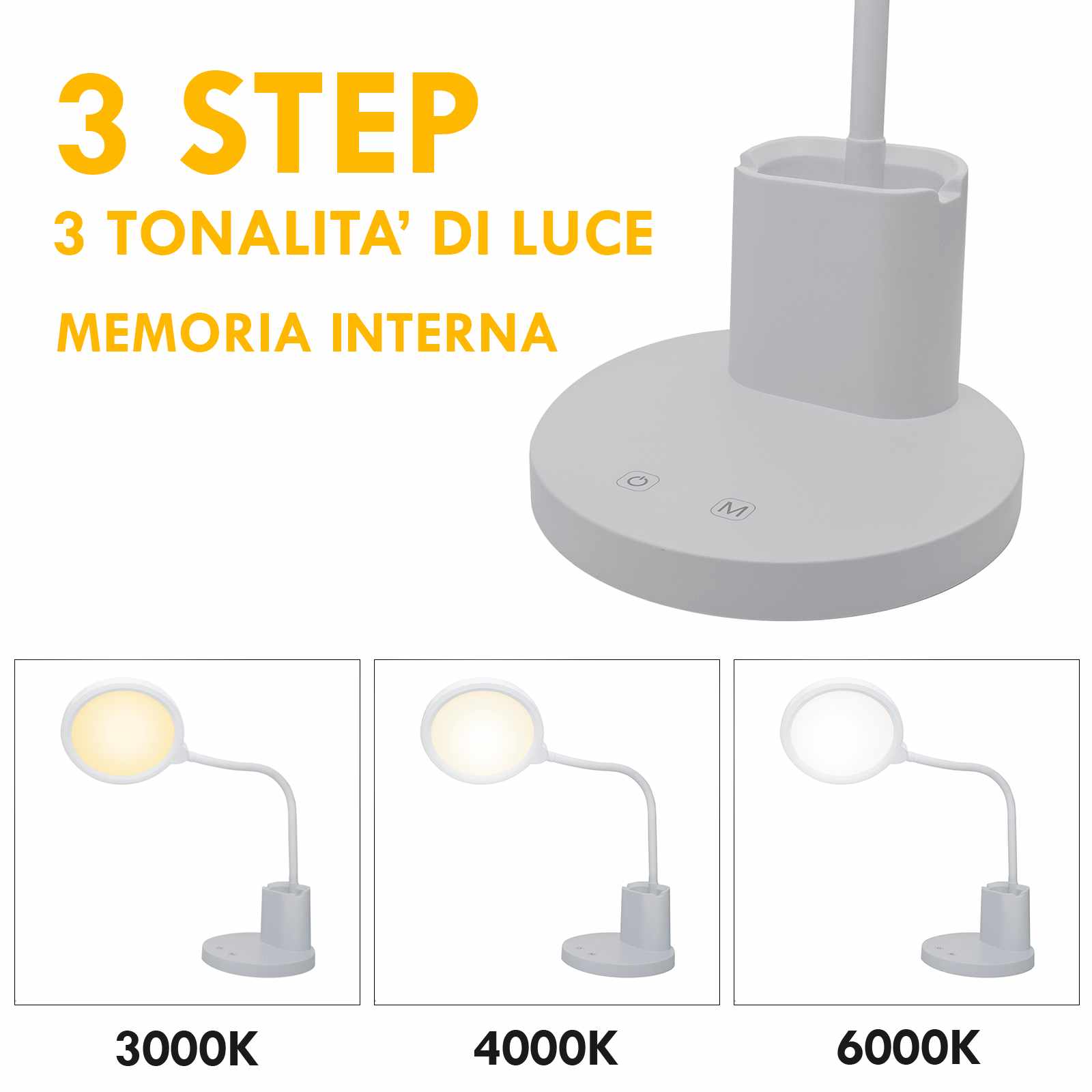 Elegante lampada da tavolo 3 step senza fili con batteria interna ricaricabile ideale per illuminare scrivanie di uffici, tavoli da lavoro, scivanie di camerette, realizzata in plastica di colore bianco integra LED con potenza 8W dotata di braccio flessibile per direzionare la luce secondo le proprie esigenze. Questa lampada ha la particolarità di emettere 3 notalità di luce 3000K (luce calda) 4000K (luce naturale) 6500K (luce fredda) tutto in un unico prodotto, inoltre è dotata di memoria interna che ricorda l'ultima temperatura di luce impostata.