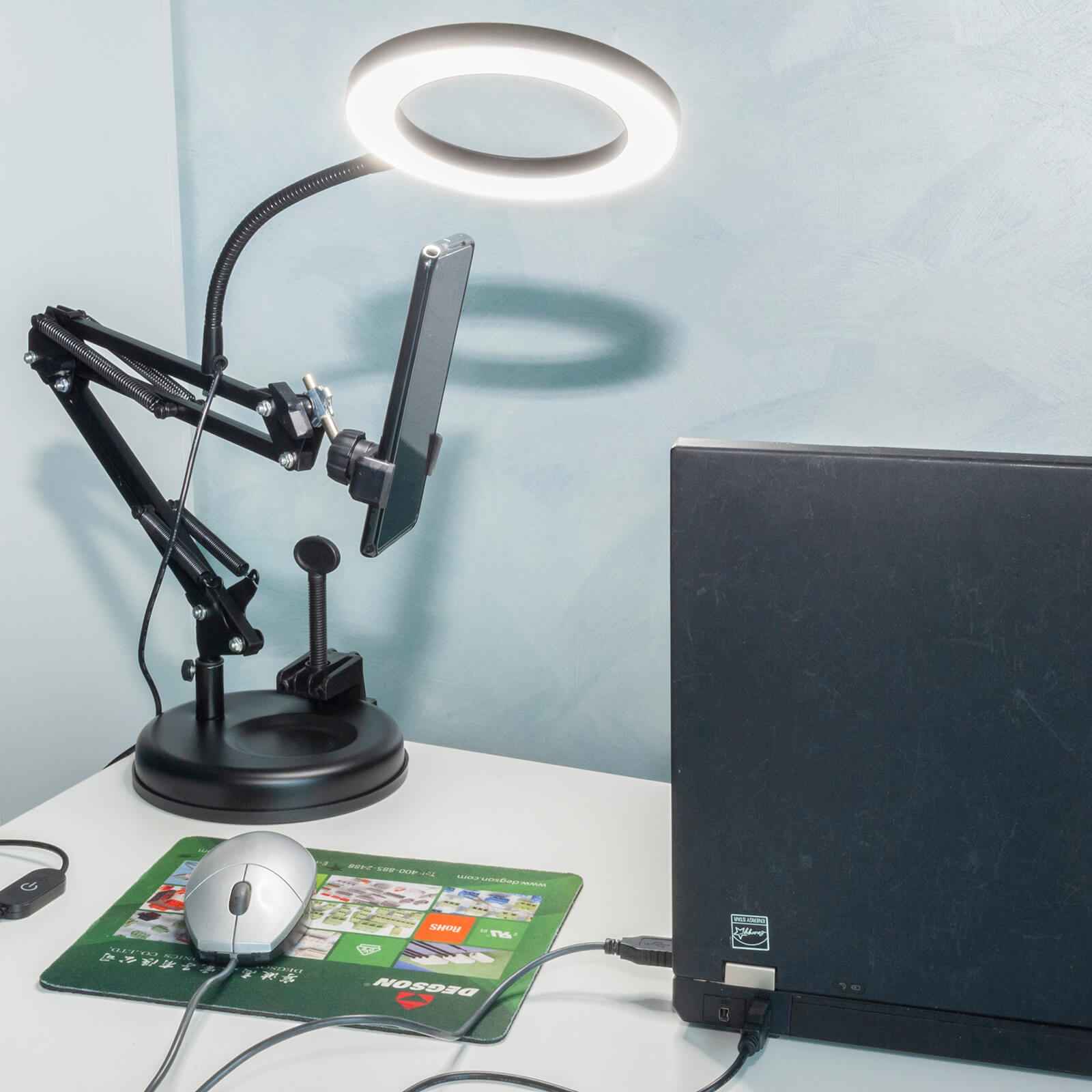 Pratica lampada da USB tavolo ideale per illuminare scrivanie di uffici, tavoli da lavoro, scivanie di camerette, realizzata in alluminio integra un LED circolare da 7W con braccio flessibile per direzionare la luce secondo le proprie esigenze. Inoltre questa particolare lampada è dotata di supporto per cellulare orientabile, abbiamo così la possibilità di avere in un unico prodotto una lampada da tavolo ed un comodo supporto per cellulare.