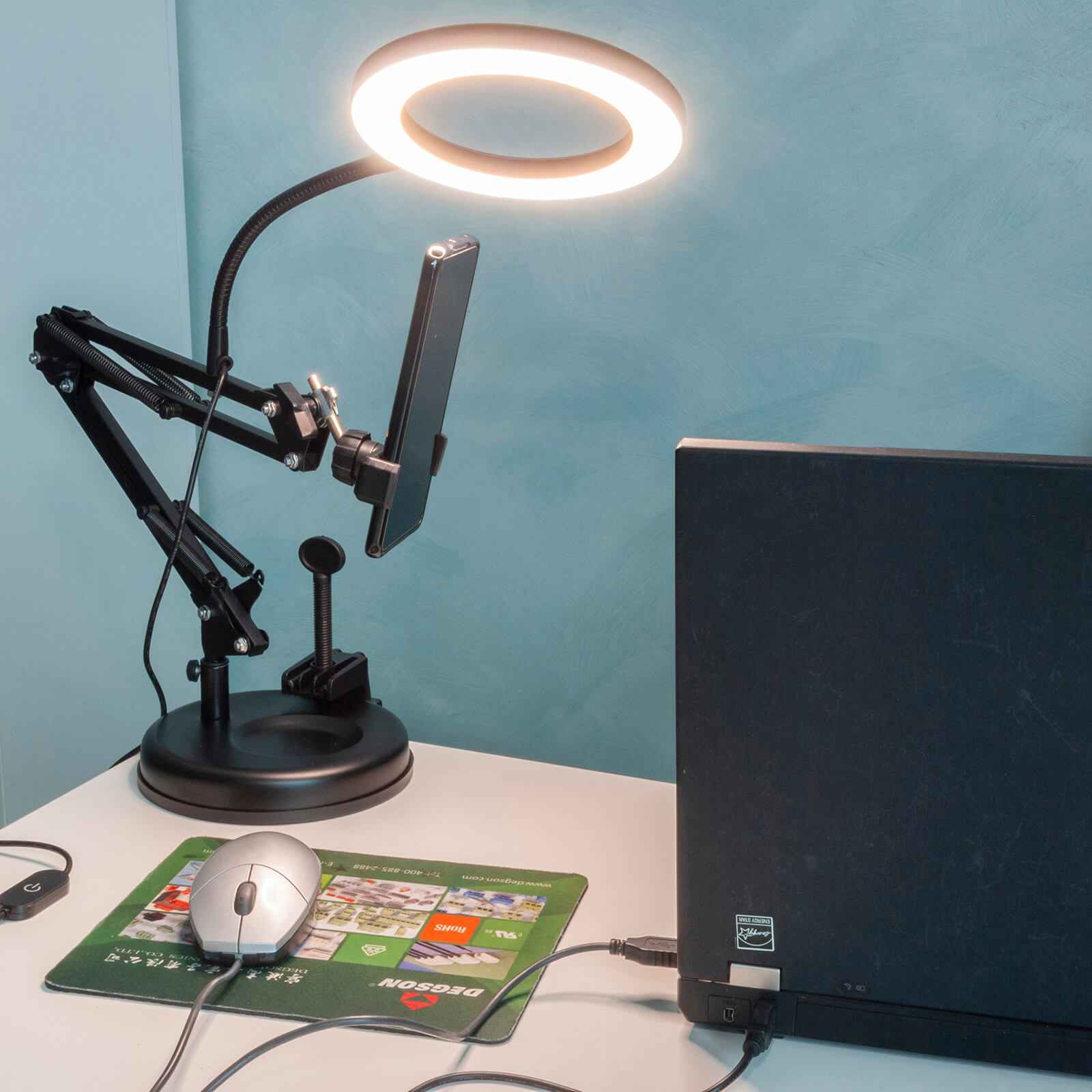 La lampada è dotata di base solida per l'appoggio su superfici piane ed è regolabile in altezza, il LED circolare è dotato di braccio flessibile per orientare meglio la luce. Nella confezione è incluso anche il supporto per il fissaggio alla scrivania.