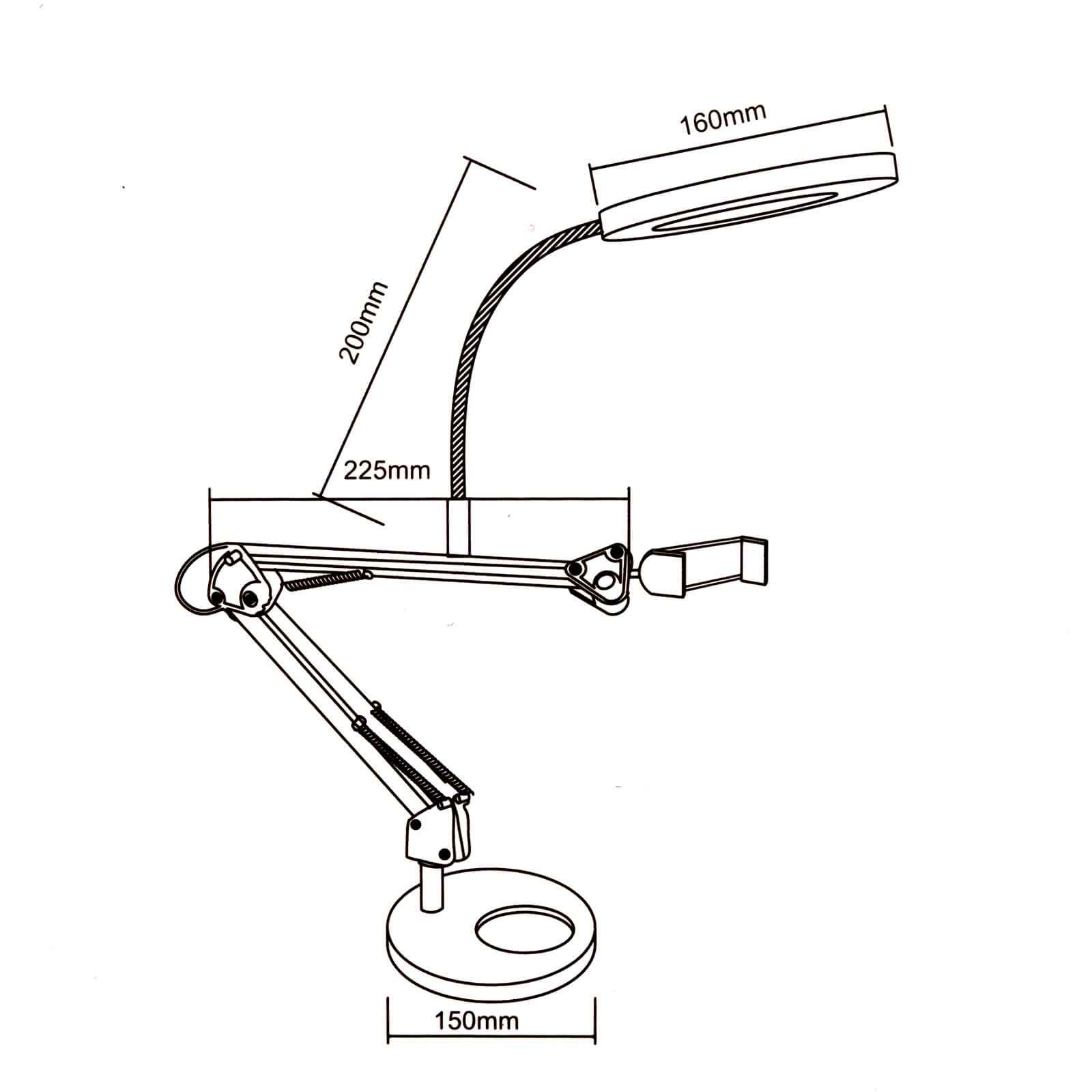 Dimensioni: Altezza massima del braccio flessibile 200mm - Diametro della lampada - 160mm - Larghezza della struttura in metallo 225mm - Diametro della base: 150mm -Lunghezza cavo USB: 180cm (circa)