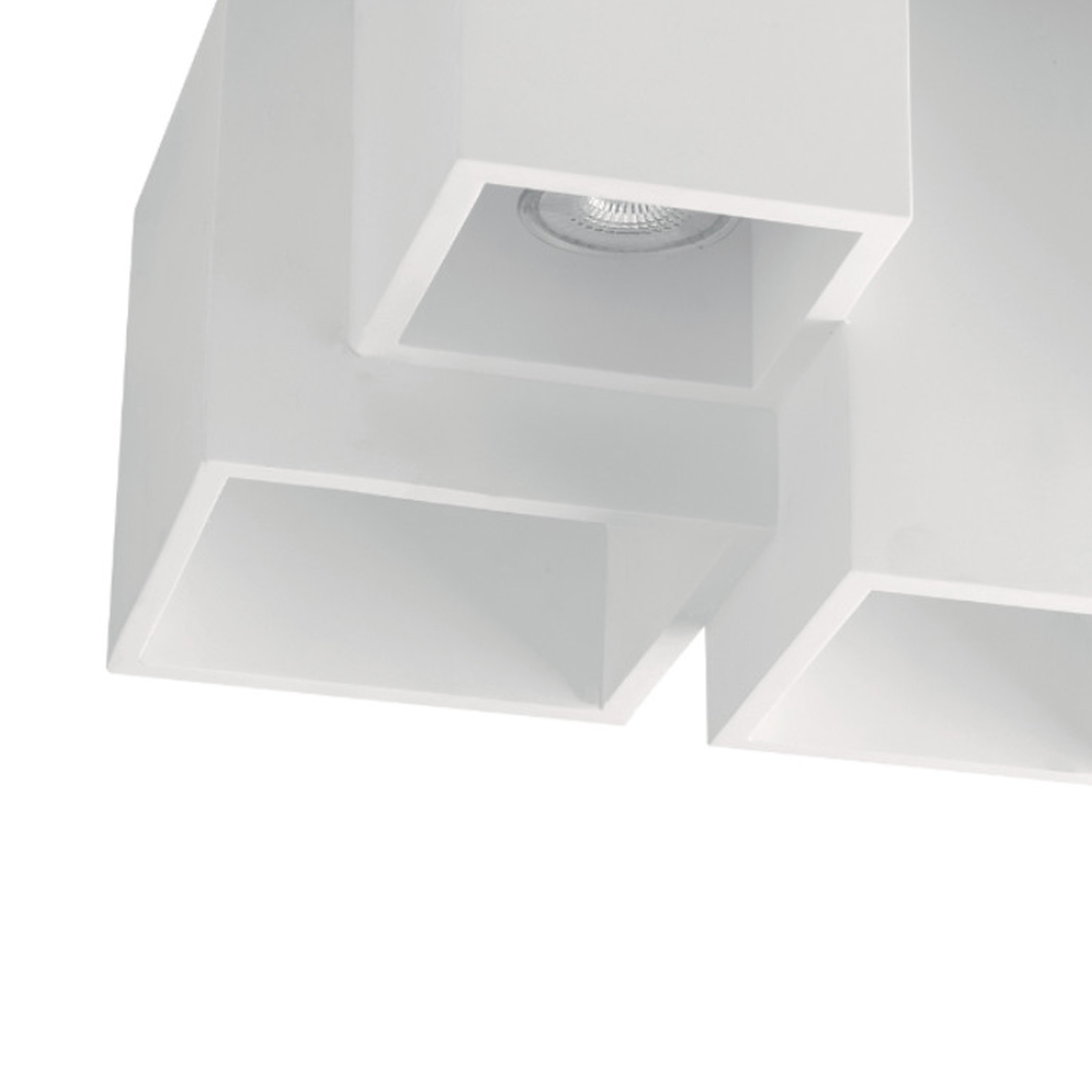 Elegante plafoniera in gesso dal design moderno di colore bianco adatta per installazioni a soffitto dotata di 5 diffusori quadrati con portalampada GU10 adatta per l'illuminazione interna di salotti, uffici, cucine modere, soggiorni, per l'illuminazione di negozi, attività commerciali, ristoranti per dare un tocco di eleganza ai propri ambienti interni.