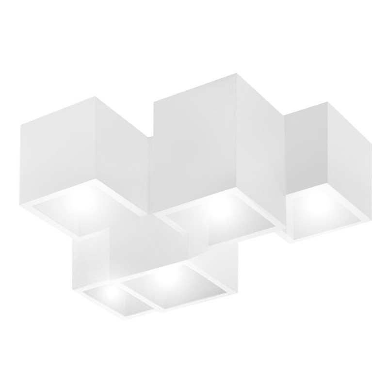 Elegante plafoniera in gesso dal design moderno di colore bianco adatta per installazioni a soffitto dotata di 5 diffusori quadrati con portalampada GU10 adatta per l'illuminazione interna di salotti, uffici, cucine modere, soggiorni, per l'illuminazione di negozi, attività commerciali, ristoranti per dare un tocco di eleganza ai propri ambienti interni.