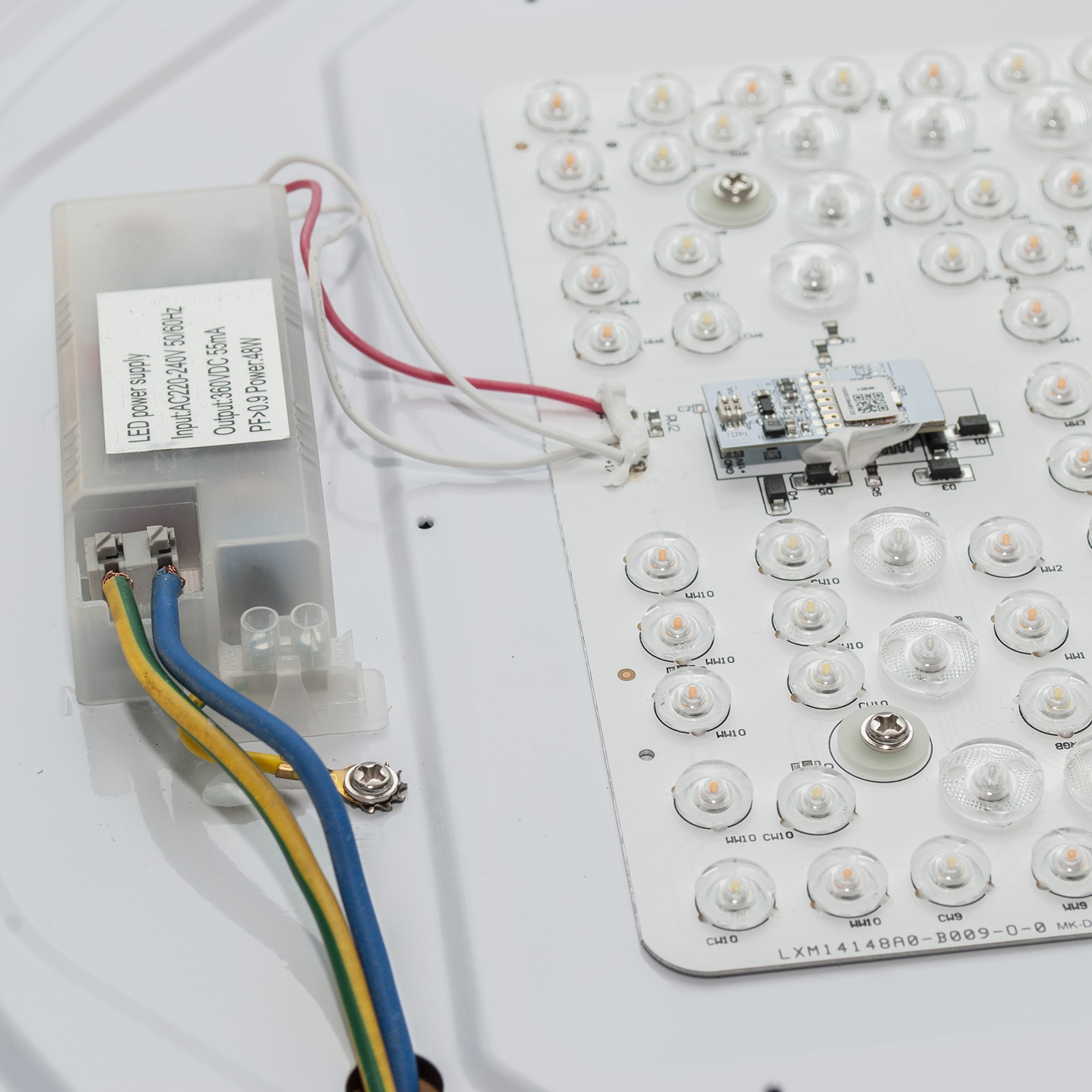 Piasta modulo LED RGB + CCT dotata di tecnologia SMART WiFi intelligente che consente la gestione da smarphone tramite apposita APP, o tramite gli assistenti vocali Google Home ed Amazon Alexa. La piastra è dotata di LED integrati con potenza 48W, ideale da sostituire in plafoniere per illuminare e decorare ambienti interni come cucine, soggiorni, salotti, camere da letto moderne, negozi, uffici, per la cromoterapia di centri massaggio, centri estetici.