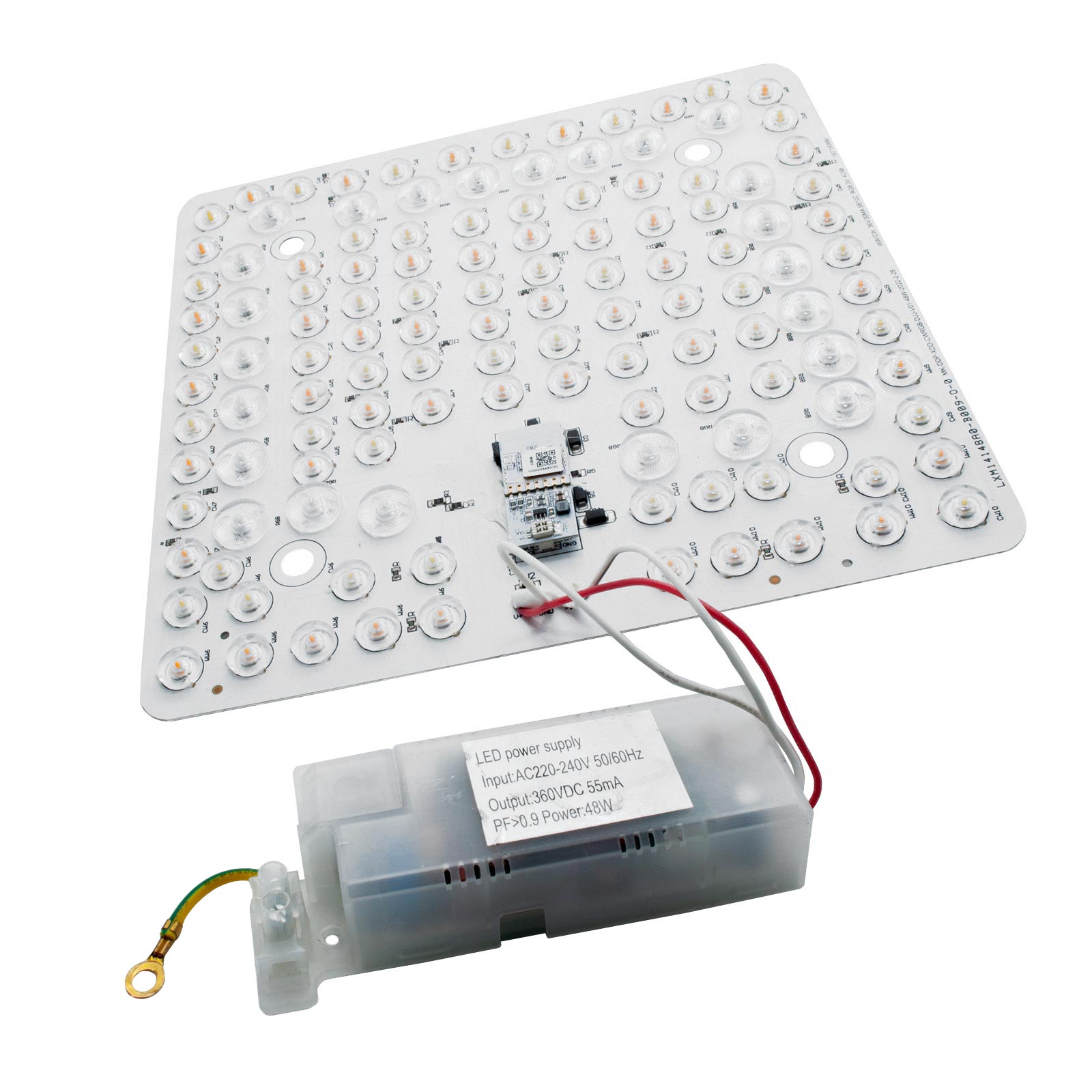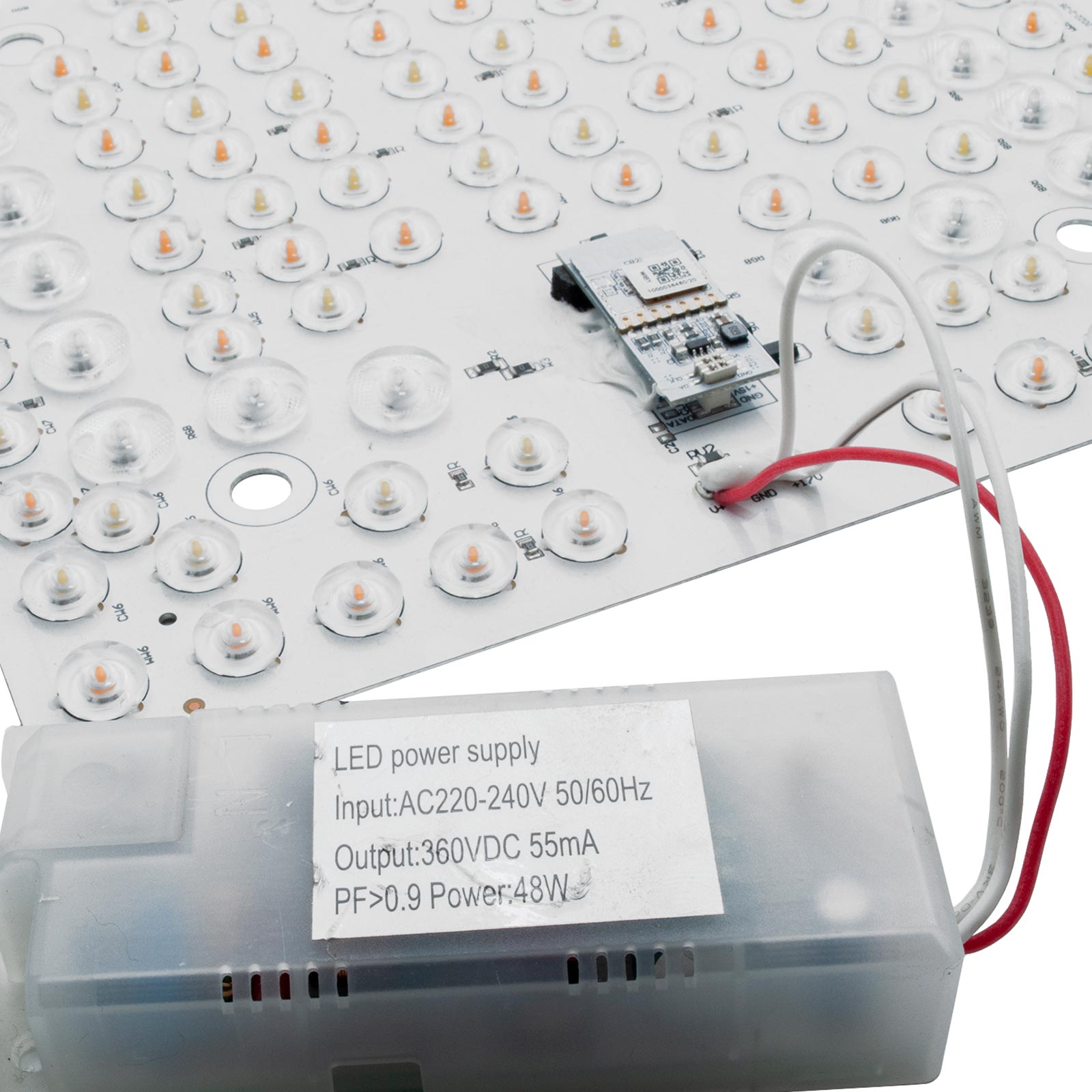 Piasta modulo LED RGB + CCT dotata di tecnologia SMART WiFi intelligente che consente la gestione da smarphone tramite apposita APP, o tramite gli assistenti vocali Google Home ed Amazon Alexa. La piastra è dotata di LED integrati con potenza 48W, ideale da sostituire in plafoniere per illuminare e decorare ambienti interni come cucine, soggiorni, salotti, camere da letto moderne, negozi, uffici, per la cromoterapia di centri massaggio, centri estetici.