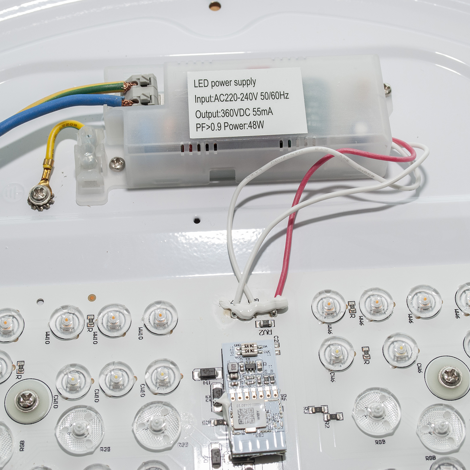 Piasta modulo LED RGB + CCT dotata di tecnologia SMART WiFi intelligente che consente la gestione da smarphone tramite apposita APP, o tramite gli assistenti vocali Google Home ed Amazon Alexa. La piastra è dotata di LED integrati con potenza 48W, ideale da sostituire in plafoniere per illuminare e decorare ambienti interni come cucine, soggiorni, salotti, camere da letto moderne, negozi, uffici, per la cromoterapia di centri massaggio, centri estetici.