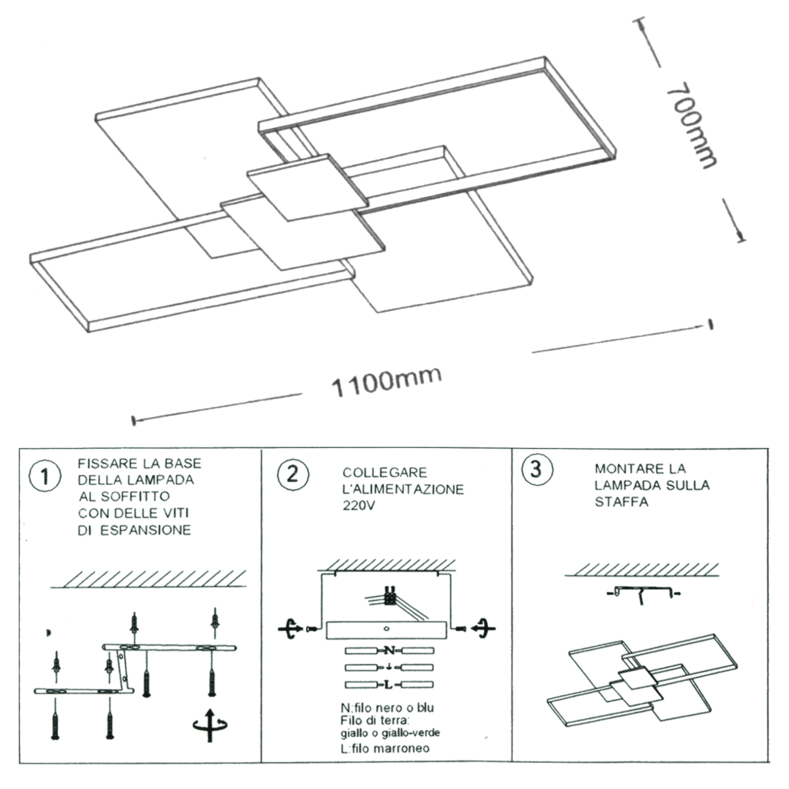 Facile da installare va fissata a soffitto tramite la staffa in dotazione, non necessita di driver, va collegata direttamente alla rete elettrica 230V. La plafoniera ha un indice di resa cromatica maggiore di 80 RA>80.