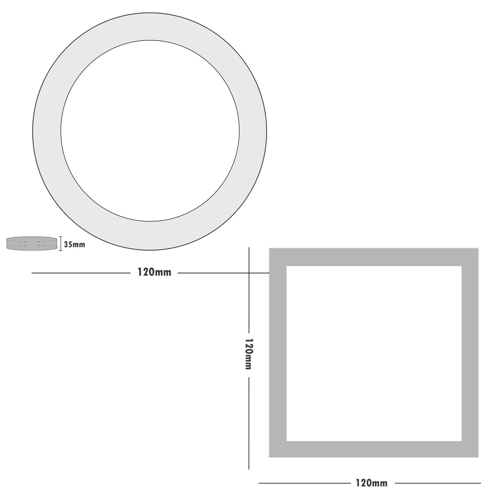 Disponibile in due forme – tonda (Ø 120 x 35 mm) e quadrata (120 x 120 x 35 mm) – questa lampada LED garantisce una luce diffusa con angolo di emissione di 120 gradi.