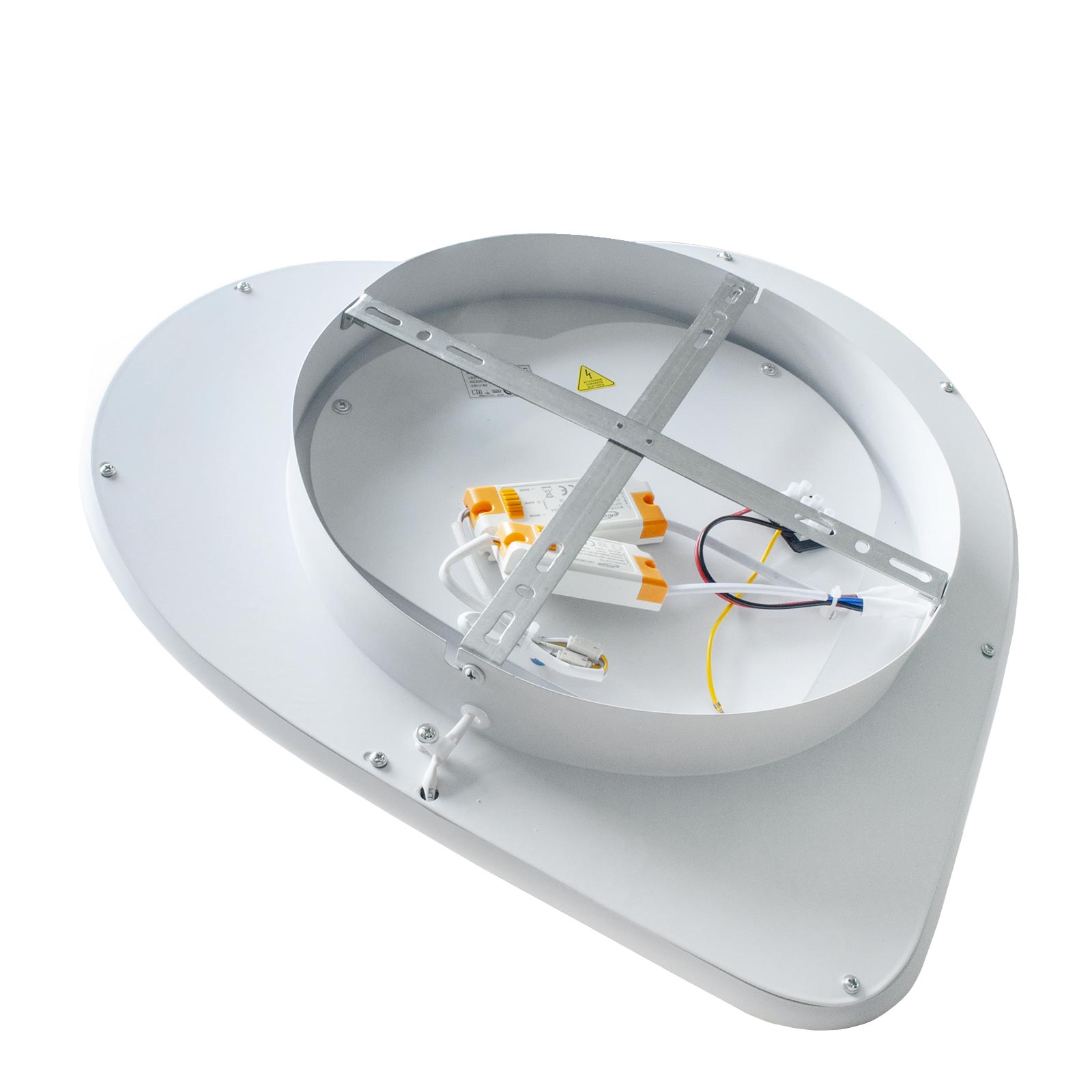 Può essere montata sia a soffitto sia a parete, offrendo massima flessibilità d’uso. Le dimensioni sono 490mm x 470mm - Dimensioni della base di fissaggio da Ø 320mm x 44mm.