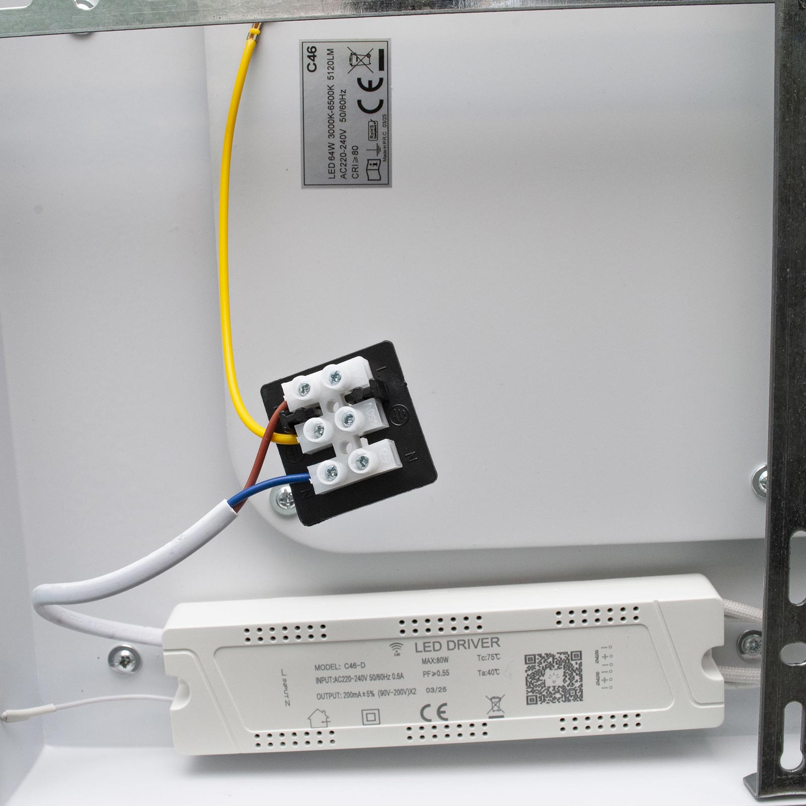 La struttura integra LED ad alta efficienza energetica con una potenza complessiva di 64W e un flusso luminoso di 5120 lumen, offrendo una luce diffusa con angolo di emissione di 180 gradi e indice di resa cromatica RA>80.