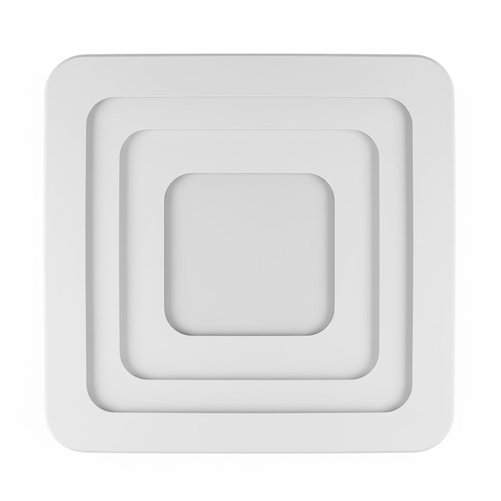 Plafoniera moderna a LED con tecnologia Bluetooth completa di telecomando che unisce design geometrico e funzionalità avanzata per l’illuminazione di interni residenziali e professionali. Realizzata in alluminio con linee morbide ed una forma quadrata con angoli smussati, si installa facilmente a soffitto tramite staffa inclusa.