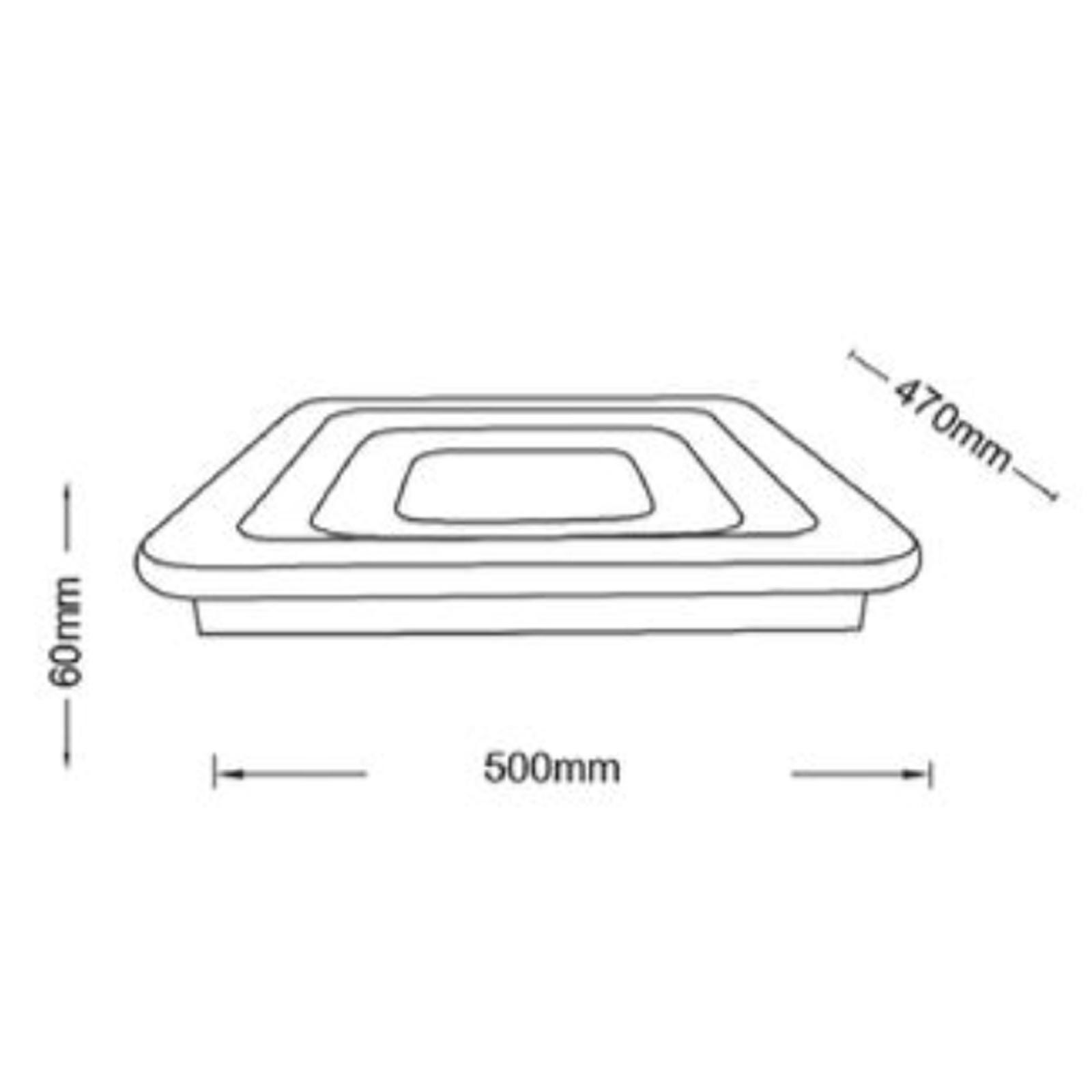 Dimensioni della plafoniera: 500mm x 470mm x 60mm (Altezza) - Dimensioni della base di fissaggio: 440mm x 440mm x 40mm.