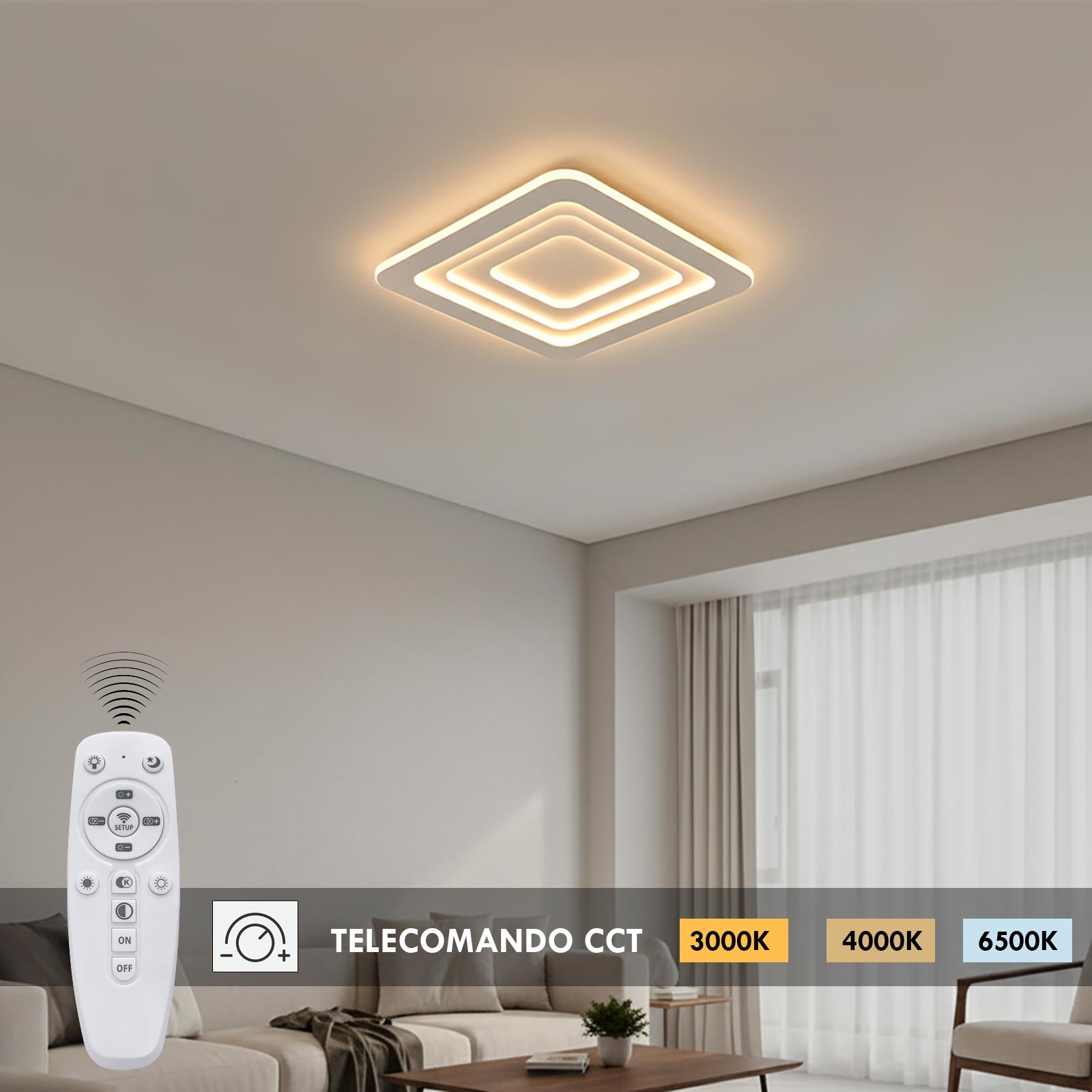 [ ASSOCIAZIONE DEL TELECOMANDO ]: per sincronizzare il telecomando con la plafoniera bisogna accenderla e premere subito il tasto "SETUP" con il simbolo del WiFi presente al centro del telecomando, quando la plafoniera lampeggia vuol dire che è stata correttamente associata.