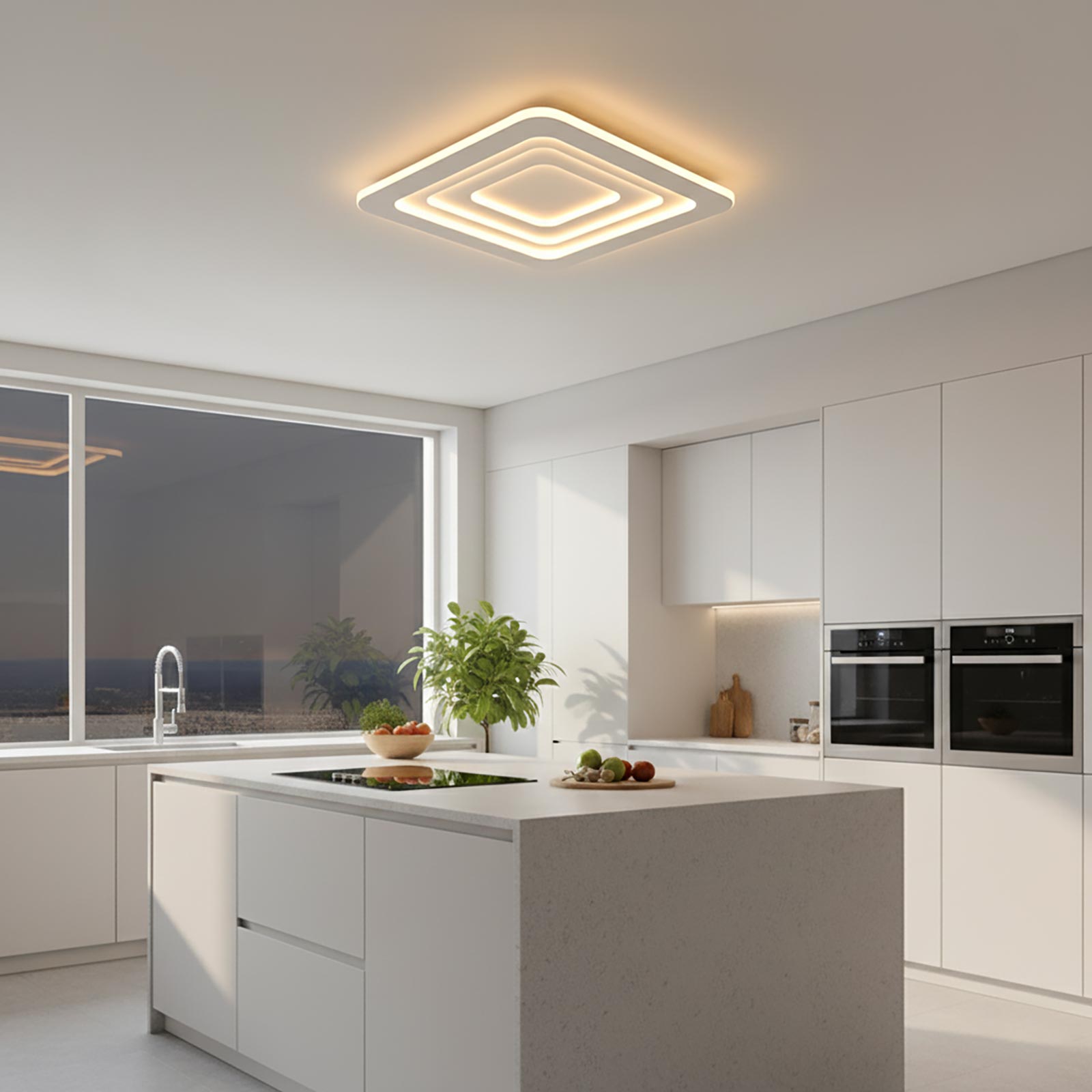 Plafoniera moderna a LED con tecnologia Bluetooth completa di telecomando che unisce design geometrico e funzionalità avanzata per l’illuminazione di interni residenziali e professionali. Realizzata in alluminio con linee morbide ed una forma quadrata con angoli smussati, si installa facilmente a soffitto tramite staffa inclusa.