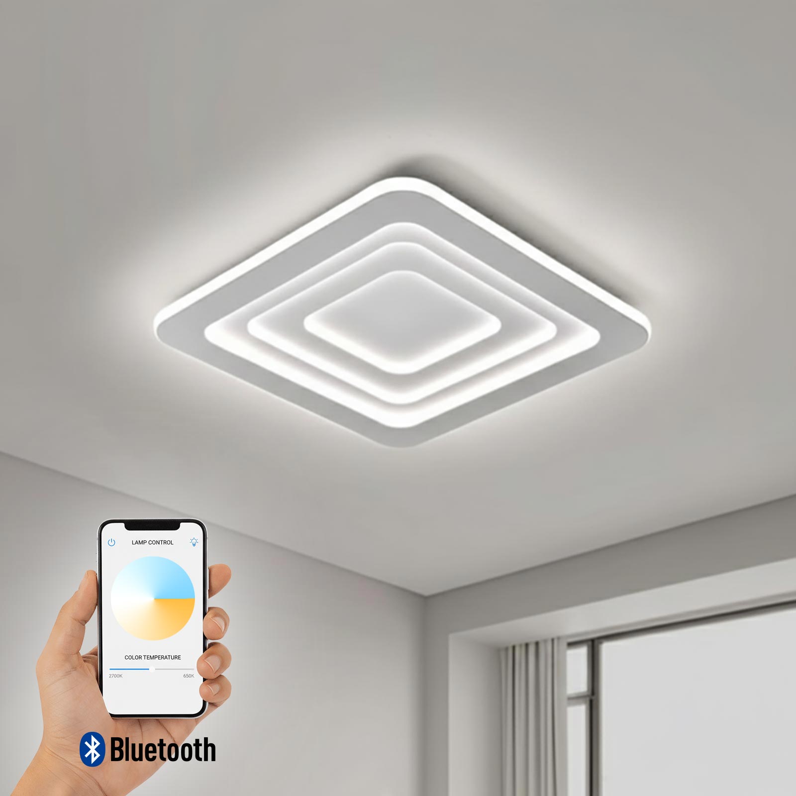 Plafoniera moderna a LED con tecnologia Bluetooth completa di telecomando che unisce design geometrico e funzionalità avanzata per l’illuminazione di interni residenziali e professionali. Realizzata in alluminio con linee morbide ed una forma quadrata con angoli smussati, si installa facilmente a soffitto tramite staffa inclusa.