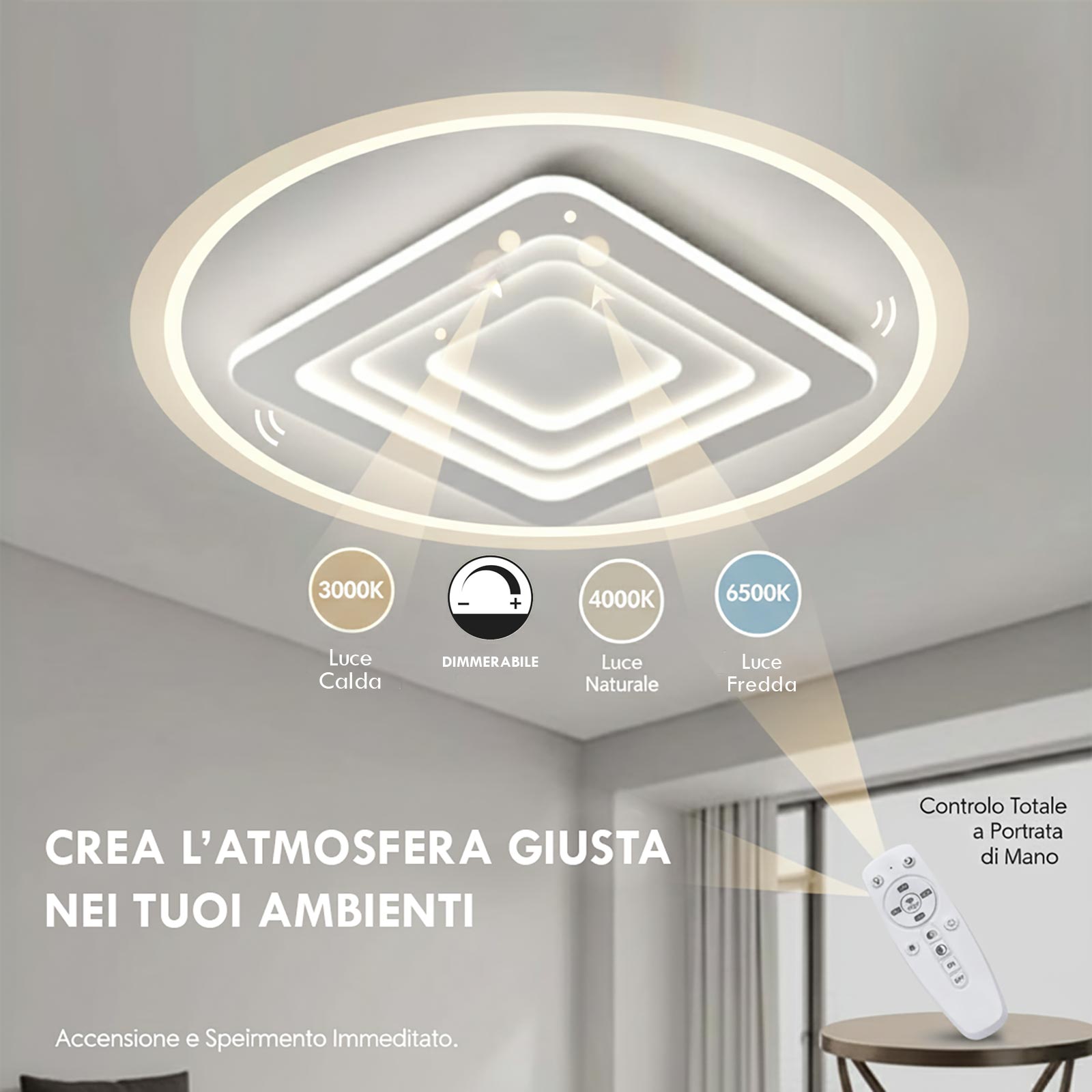 [ ASSOCIAZIONE DEL TELECOMANDO ]: per sincronizzare il telecomando con la plafoniera bisogna accenderla e premere subito il tasto "SETUP" con il simbolo del WiFi presente al centro del telecomando, quando la plafoniera lampeggia vuol dire che è stata correttamente associata.