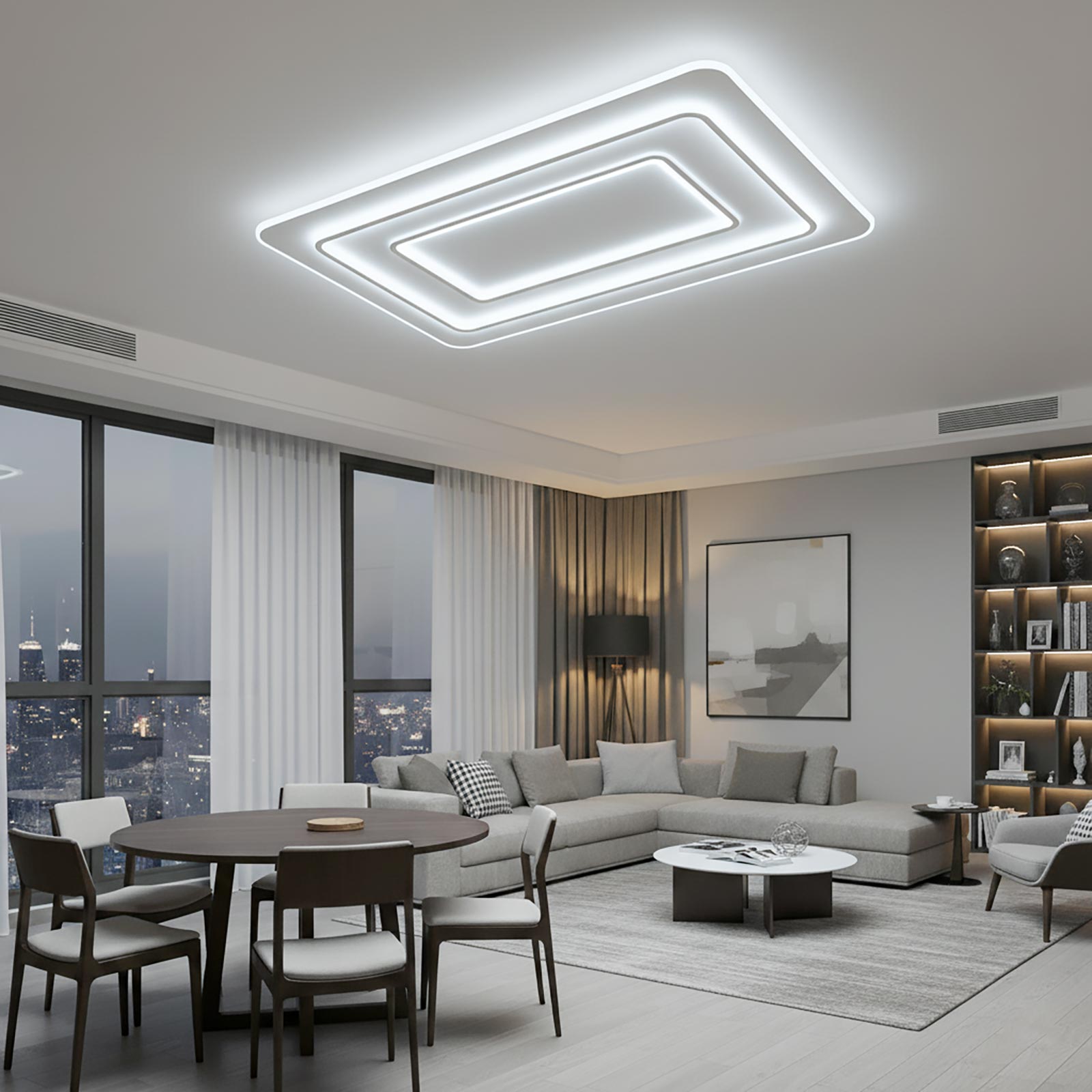Elegante plafoniera CCT BLUETOOTH completa di telecomando dal design moderno e lo stile geometrico adatta per installazioni a soffitto dotata LED integrati con potenza totale di 123W ideale per l'illuminazione e la decorazione di grandi ambienti come soggiorni, salotti, cucine moderne, camere da letto ed in tutti quei posti dove si vuole installare un prodotto dallo stile unico e versatile.