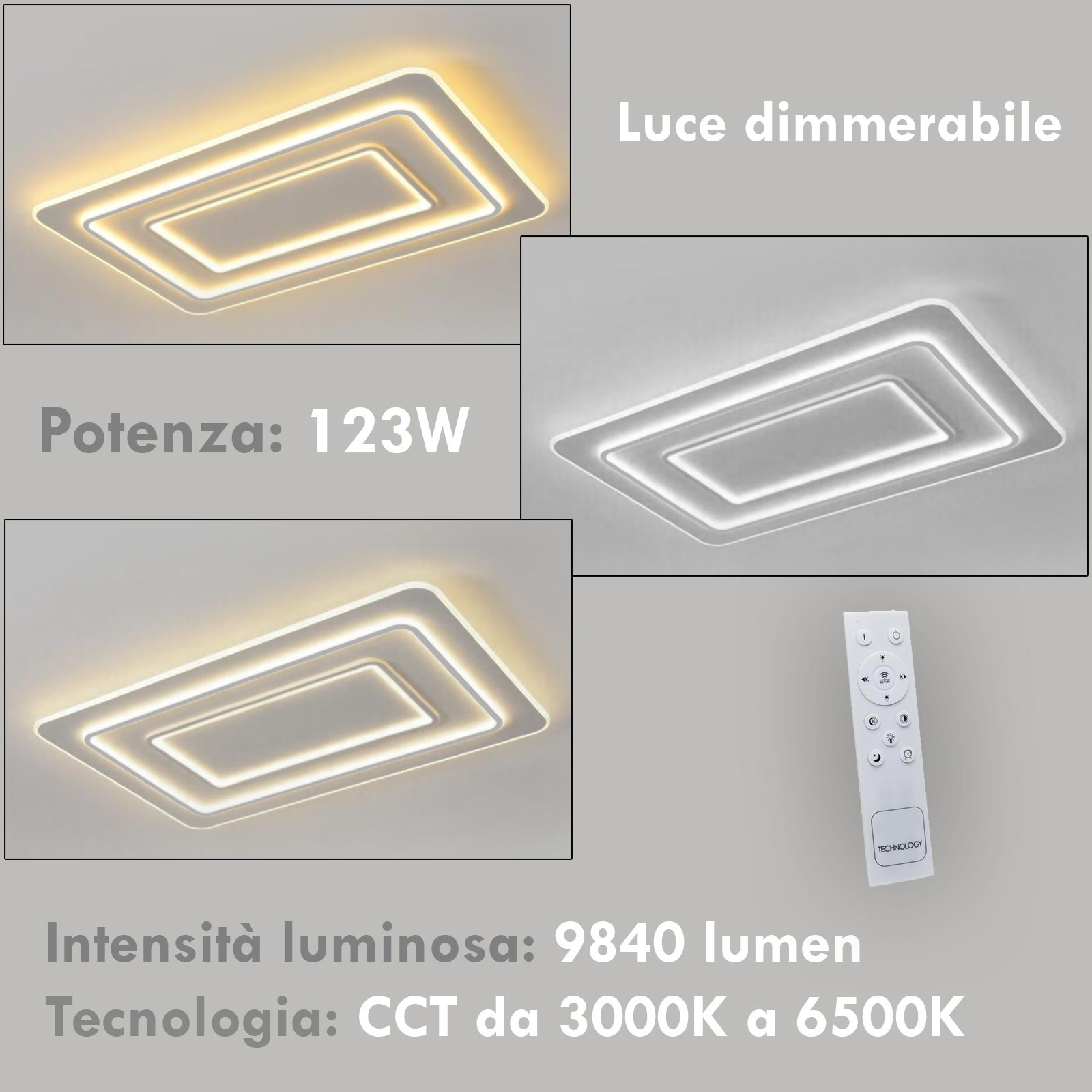 Questa plafoniera è dotata di telecomando in radio frequenza, grazie al quale è possibile abbassare o alzare l'intensità luminosa, oppure cambiare la tonalità di luce passando da una luce calda 3000k più accogliente, fino a luce bianca fredda di 6500k per un'illuminazione più brillante, ed ancora sempre tramite il telecomando è possibile impostare un timer di spegnimento o impostare la modalità notte che abbassa l'intensità luminosa al minimo per un miglior riposo durante la notte.