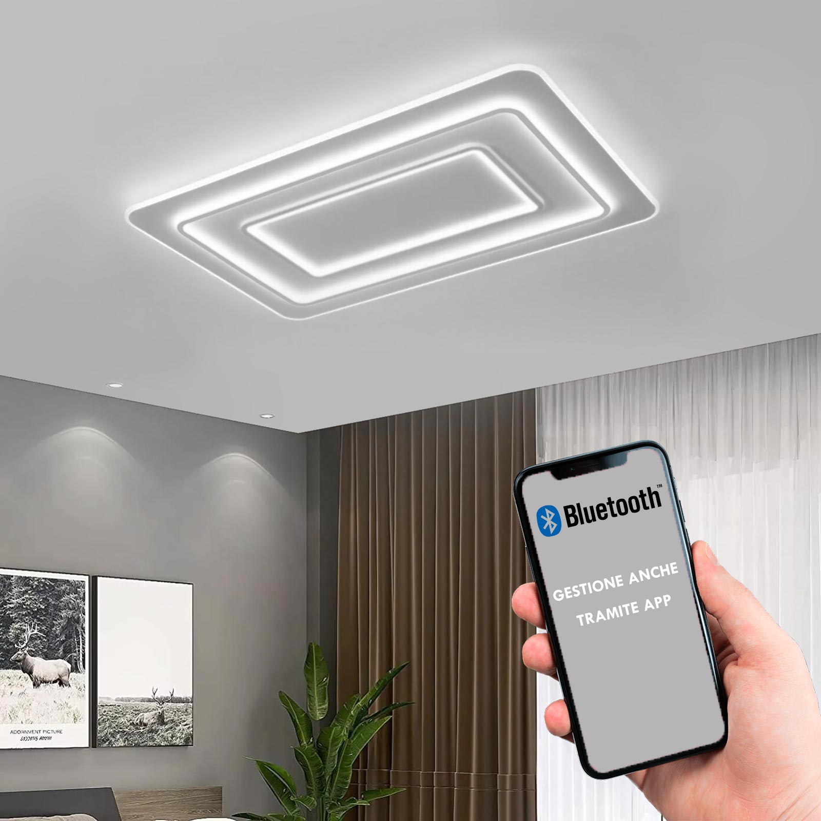 Elegante plafoniera CCT BLUETOOTH completa di telecomando dal design moderno e lo stile geometrico adatta per installazioni a soffitto dotata LED integrati con potenza totale di 123W ideale per l'illuminazione e la decorazione di grandi ambienti come soggiorni, salotti, cucine moderne, camere da letto ed in tutti quei posti dove si vuole installare un prodotto dallo stile unico e versatile.