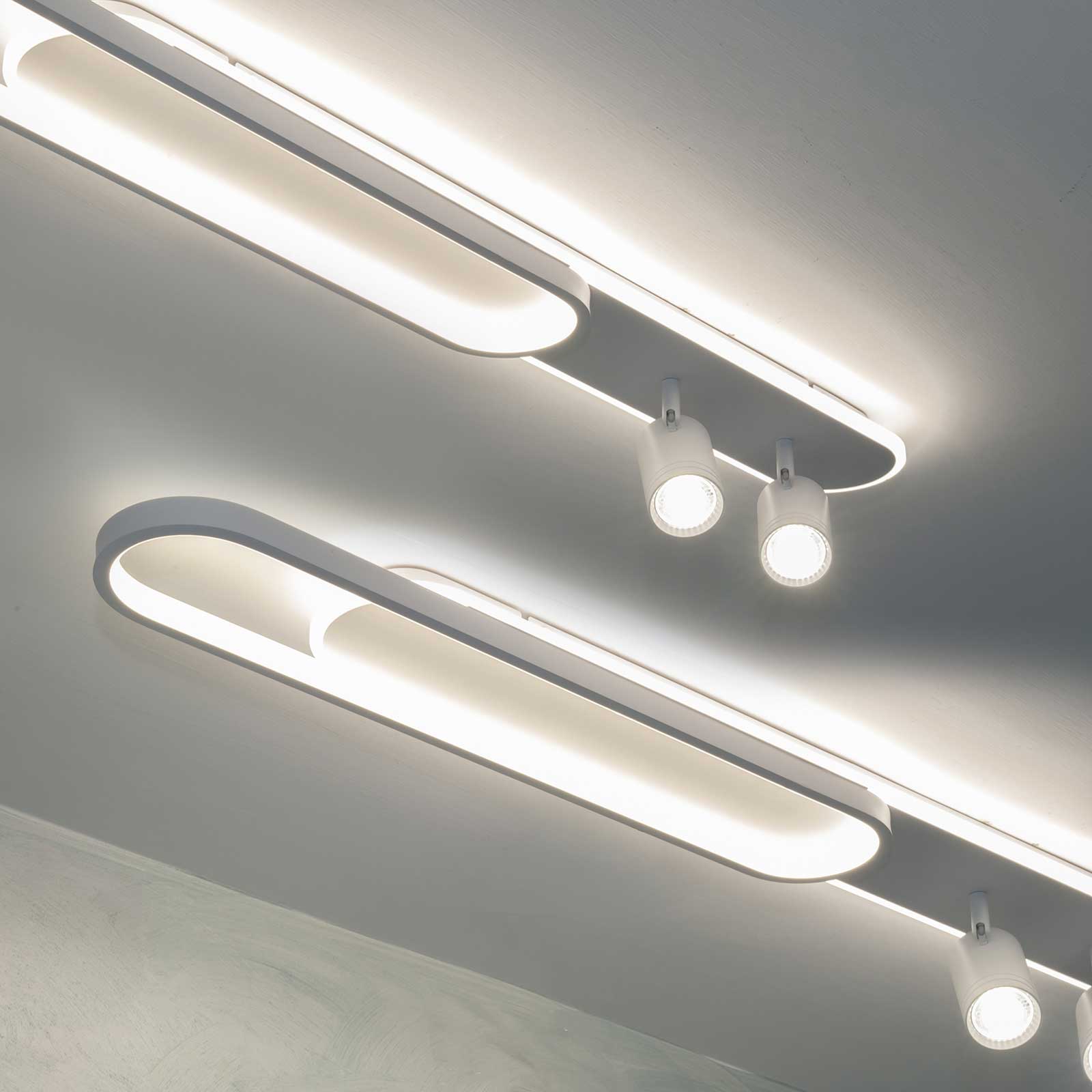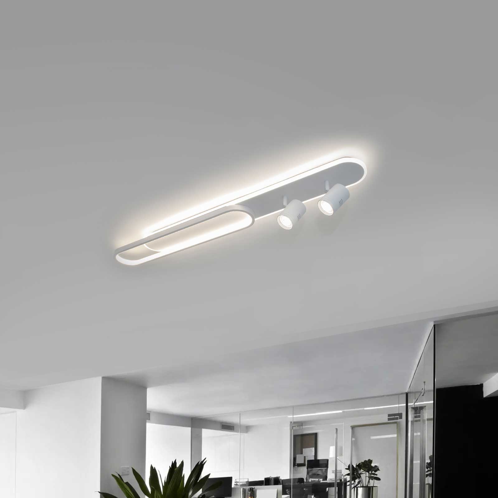 La plafoniera ha la forma ovale ed è circondata da una striscia di LED con potenza 50W disponibile in 3 temperature di luce 3000K luce calda, 4000K luce naturale e 6500K luce fredda. I LED integrati generano un'intensità luminosa di 4000 lumen adatta anche per grandi ambienti, inoltre grazie alla possibilità di inserire 2 lampade GU10 abbiamo la possibilità di aumentare l'intensità luminosa.