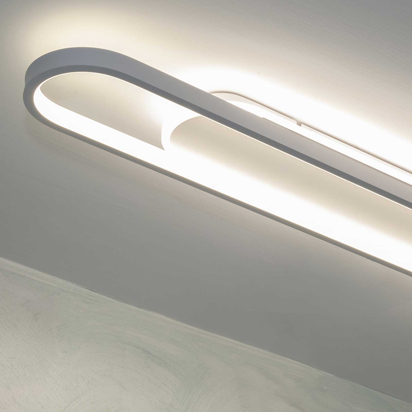 La plafoniera ha la forma ovale ed è circondata da una striscia di LED con potenza 50W disponibile in 3 temperature di luce 3000K luce calda, 4000K luce naturale e 6500K luce fredda. I LED integrati generano un'intensità luminosa di 4000 lumen adatta anche per grandi ambienti, inoltre grazie alla possibilità di inserire 2 lampade GU10 abbiamo la possibilità di aumentare l'intensità luminosa.