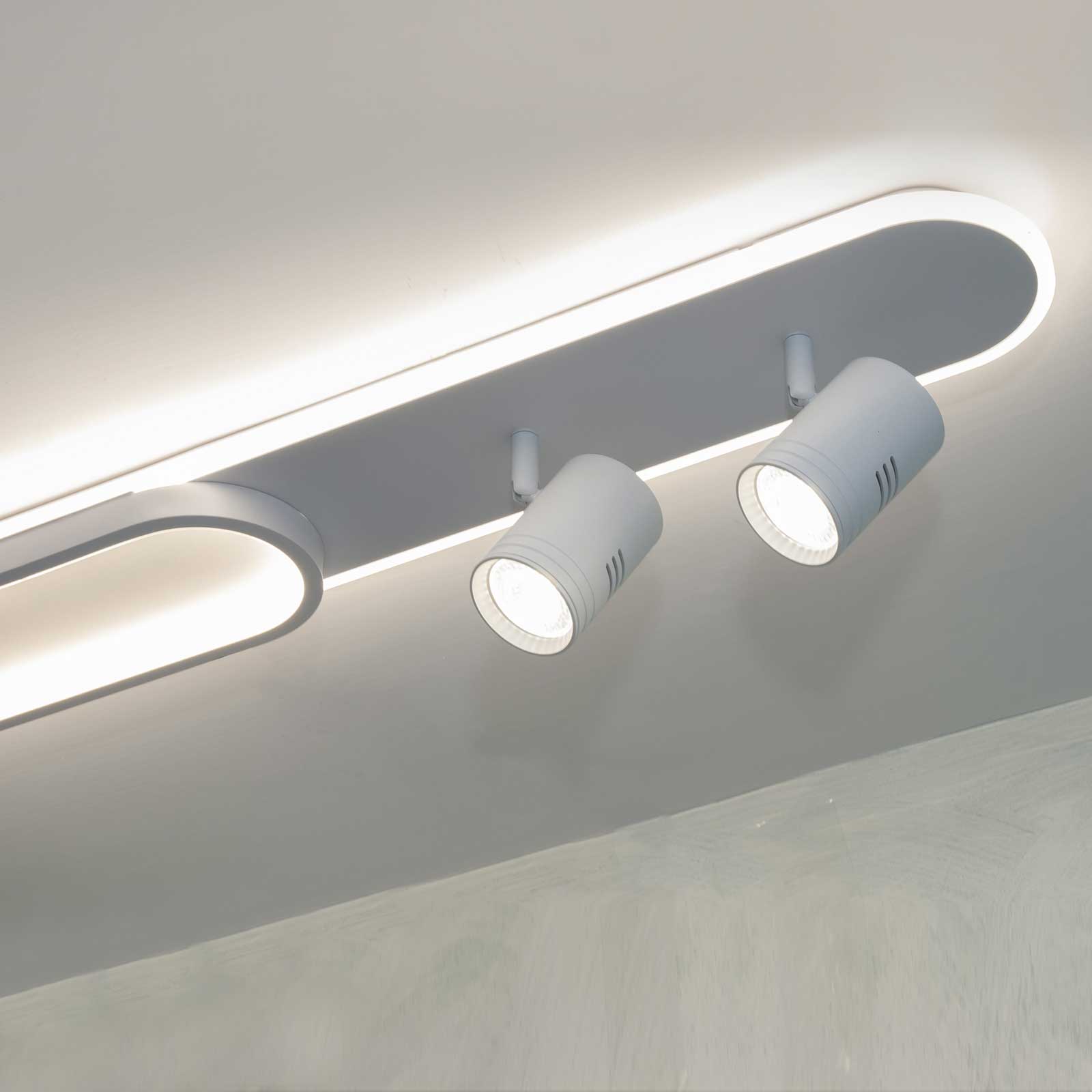 Elegante e particolare plafoniera da soffitto dotata di LED integrati con potenza 50W e 2 faretti SPOT con attacco GU10. I led integrati emettono luce indiretta creando un effetto luminoso particolare sul soffitto, metre i 2 faretti orientabili consentono l'alloggiamento di 2 lampade GU10 ideali per direzionare la luce secondo le proprie esigenze. (Il prodotto viene fornito completo di due lampade GU10 da 8W).