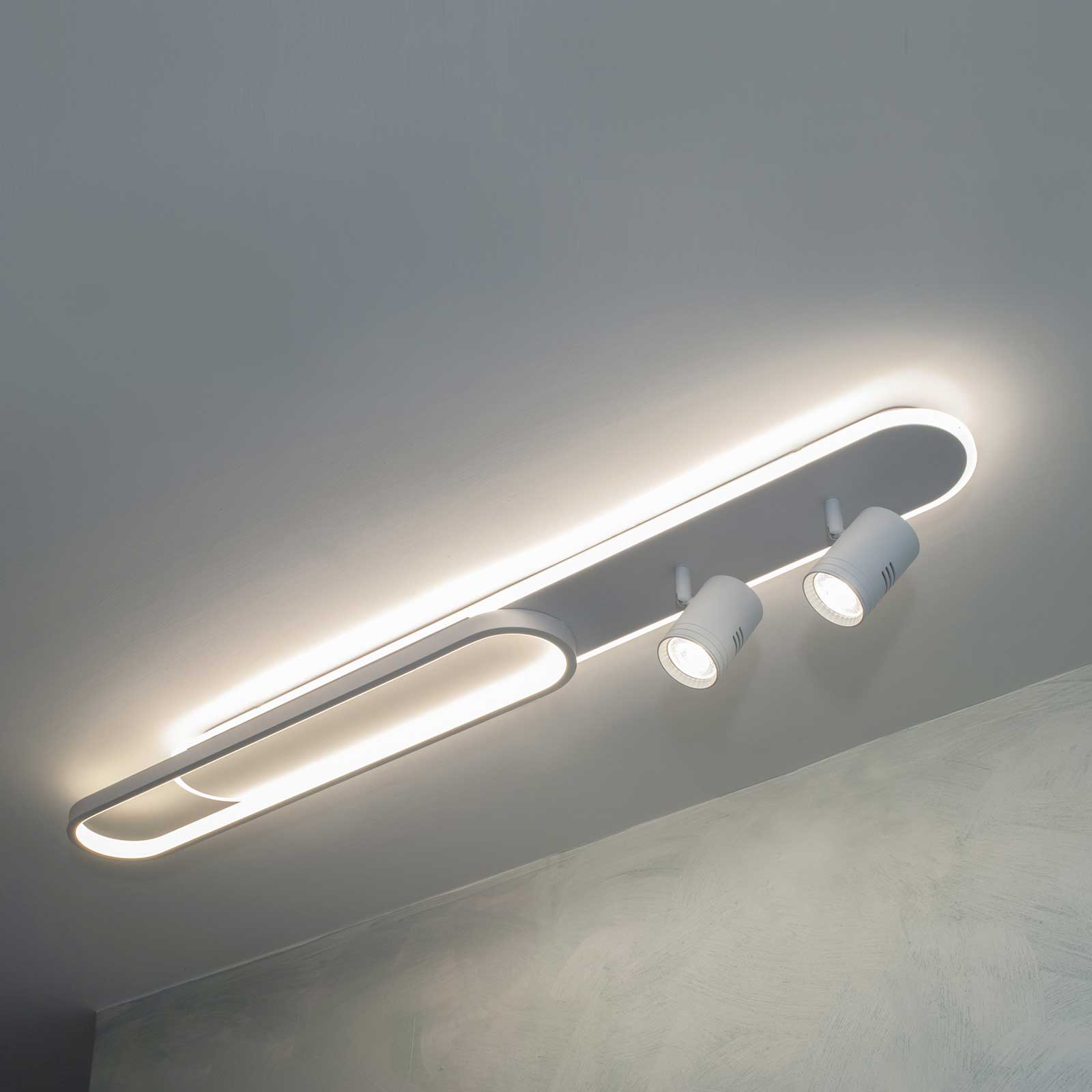 La plafoniera ha la forma ovale ed è circondata da una striscia di LED con potenza 50W disponibile in 3 temperature di luce 3000K luce calda, 4000K luce naturale e 6500K luce fredda. I LED integrati generano un'intensità luminosa di 4000 lumen adatta anche per grandi ambienti, inoltre grazie alla possibilità di inserire 2 lampade GU10 abbiamo la possibilità di aumentare l'intensità luminosa.