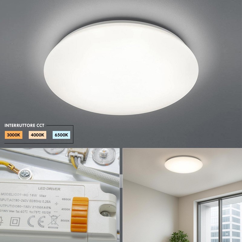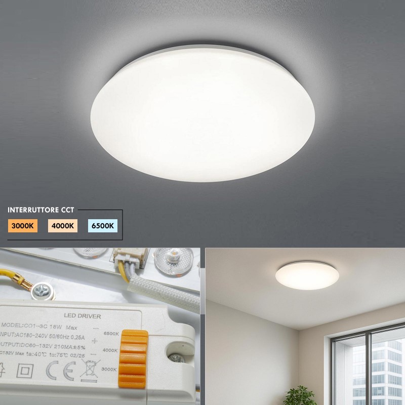 La lampada da soffitto è dotata di tecnologia LED a basso consumo energetico con selettore CCT integrato nel driver, che consente di impostare la temperatura di colore tra 3000K (luce calda), 4000K (luce neutra) e 6500K (luce fredda), offrendo massima versatilità a seconda dell’ambiente e delle preferenze.