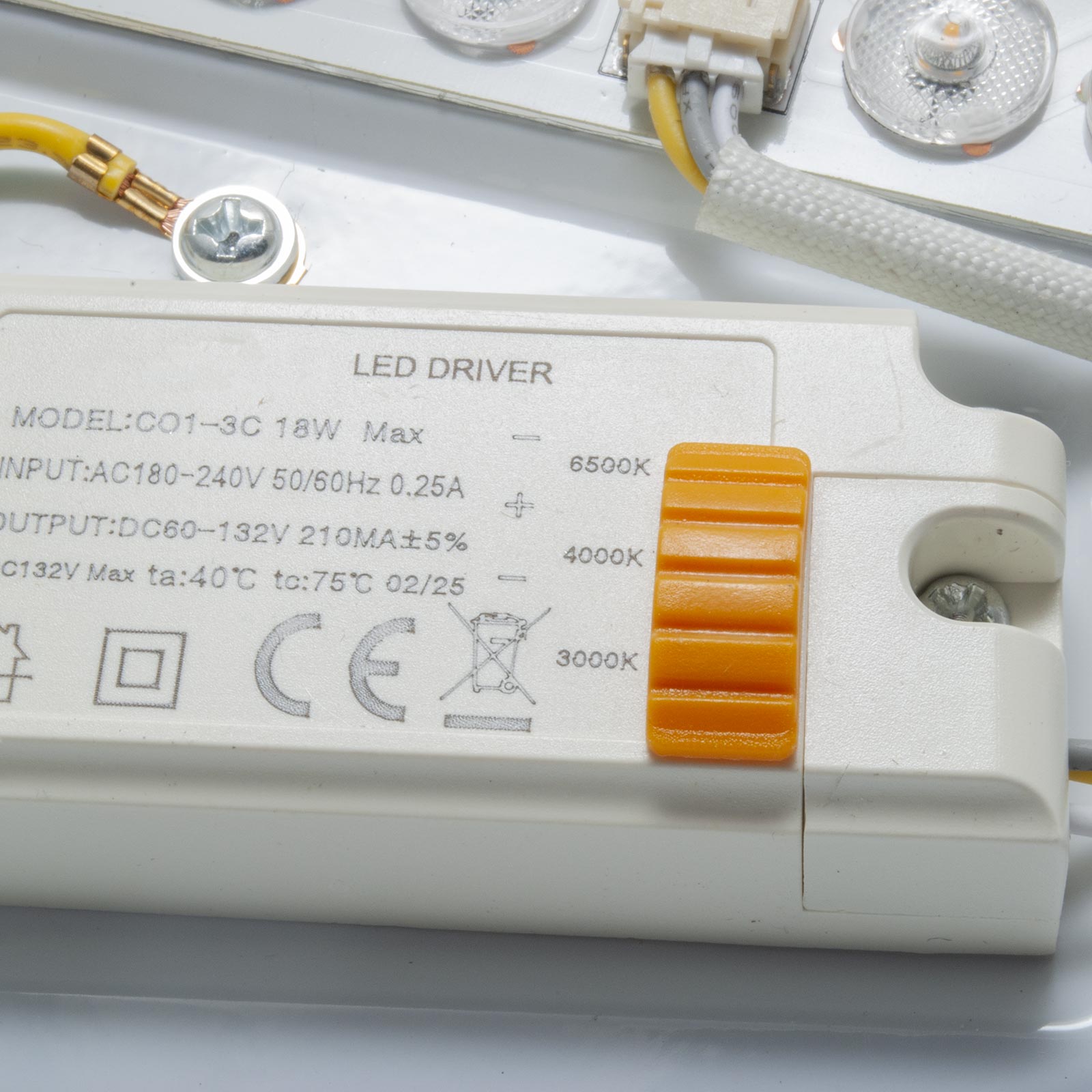 La lampada da soffitto è dotata di tecnologia LED a basso consumo energetico con selettore CCT integrato nel driver, che consente di impostare la temperatura di colore tra 3000K (luce calda), 4000K (luce neutra) e 6500K (luce fredda), offrendo massima versatilità a seconda dell’ambiente e delle preferenze.