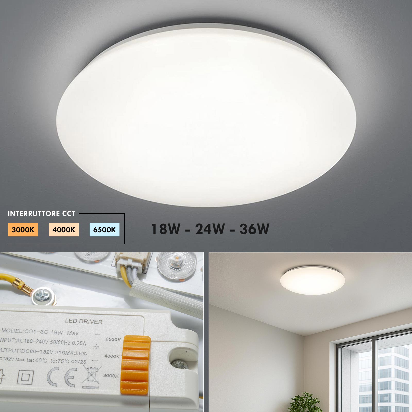 La lampada da soffitto è dotata di tecnologia LED a basso consumo energetico con selettore CCT integrato nel driver, che consente di impostare la temperatura di colore tra 3000K (luce calda), 4000K (luce neutra) e 6500K (luce fredda), offrendo massima versatilità a seconda dell’ambiente e delle preferenze.