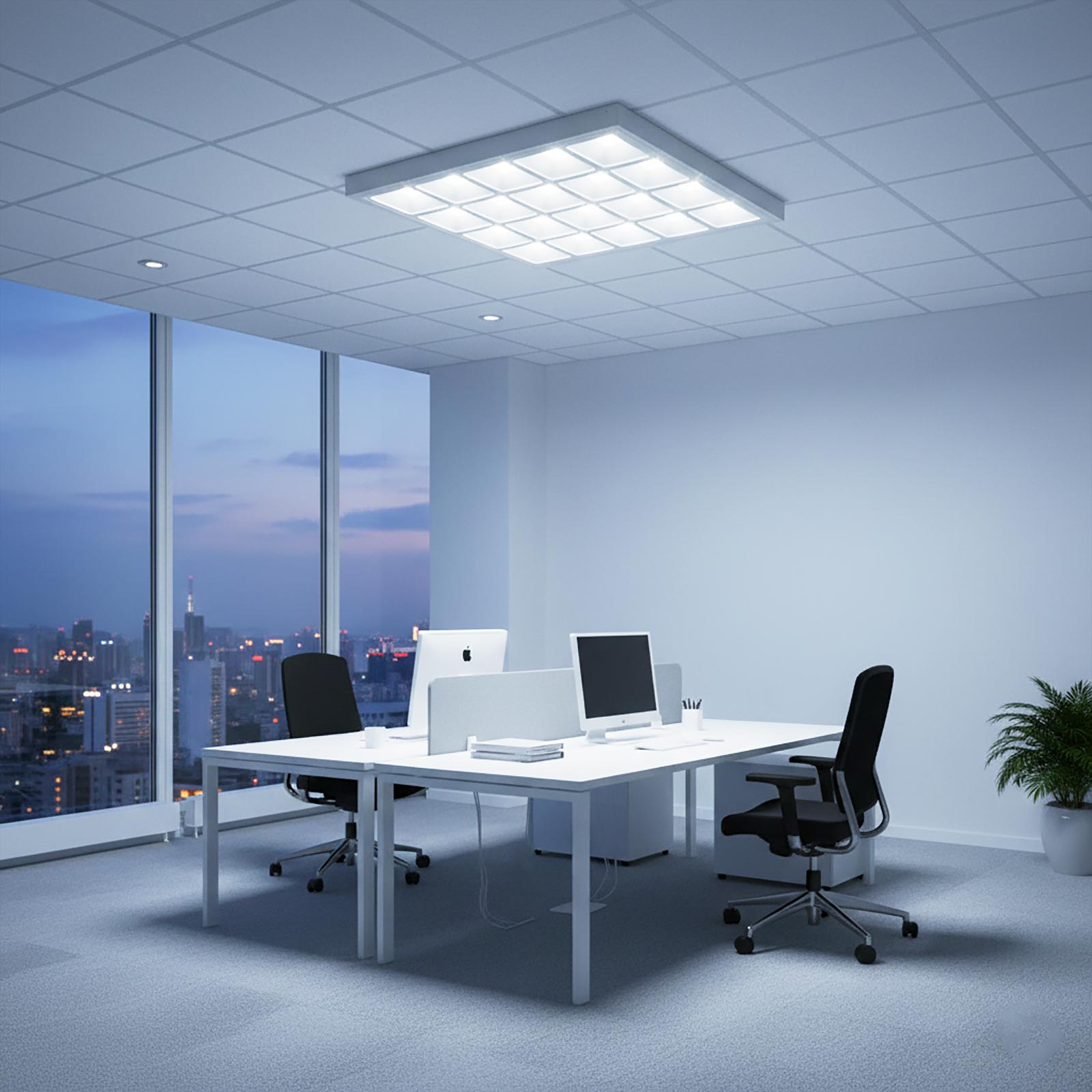Plafoniera LED slim 60x60cm completa di cornice quadrata per il fissaggio a soffitto ideale per uffici, centri commerciali, locali commerciali, negozi, magazzini, ospedali, cliniche, aule, sale didattiche, hotel ecc.. La plafoniera ha un design moderno ed è realizzata in alluminio di colore bianco con 25 diffusori con copertura opaca che generano una potenza di 40W con una resa di 400W delle vecchie lampade alogene.
