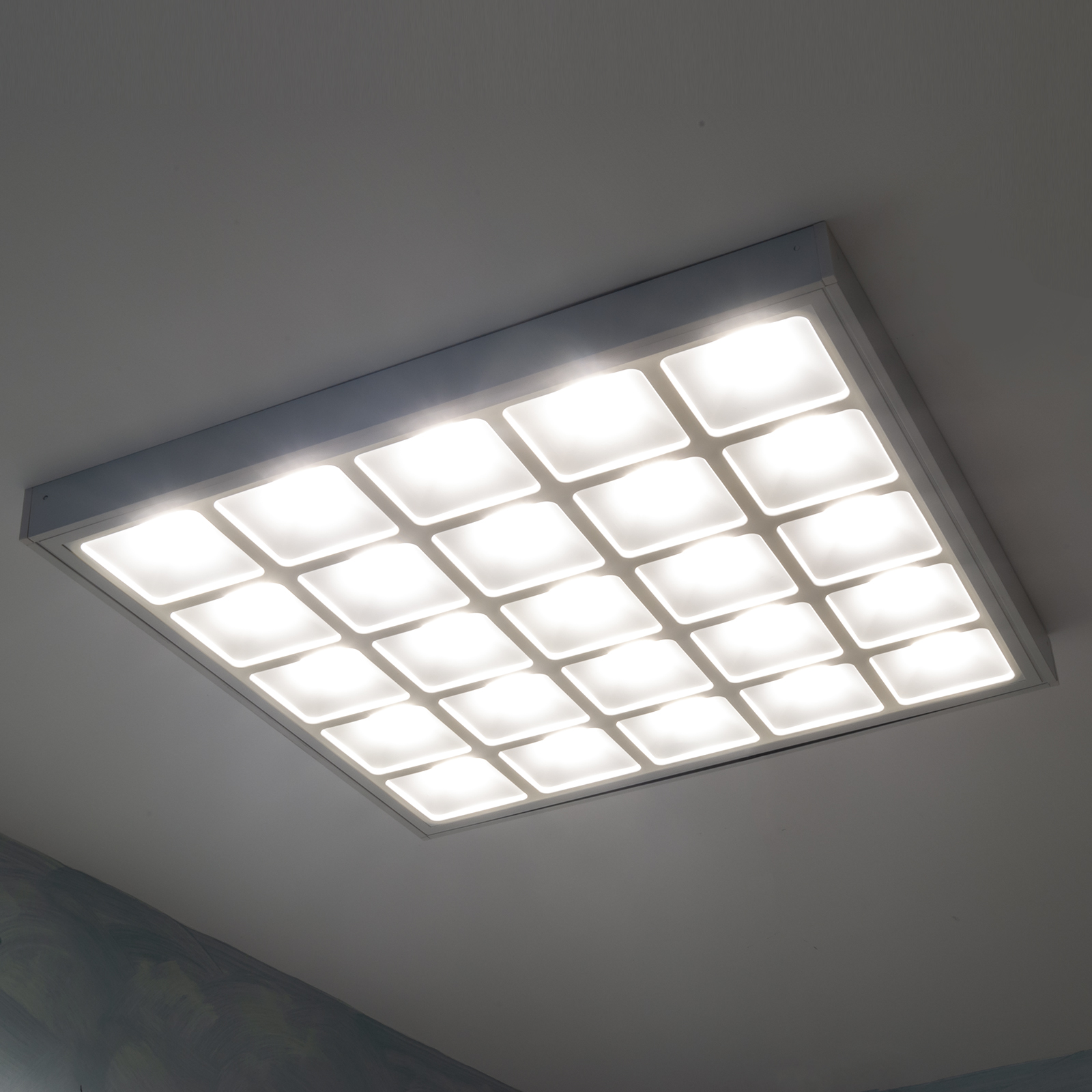 Plafoniera LED slim 60x60cm completa di cornice quadrata per il fissaggio a soffitto ideale per uffici, centri commerciali, locali commerciali, negozi, magazzini, ospedali, cliniche, aule, sale didattiche, hotel ecc.. La plafoniera ha un design moderno ed è realizzata in alluminio di colore bianco con 25 diffusori con copertura opaca che generano una potenza di 40W con una resa di 400W delle vecchie lampade alogene.