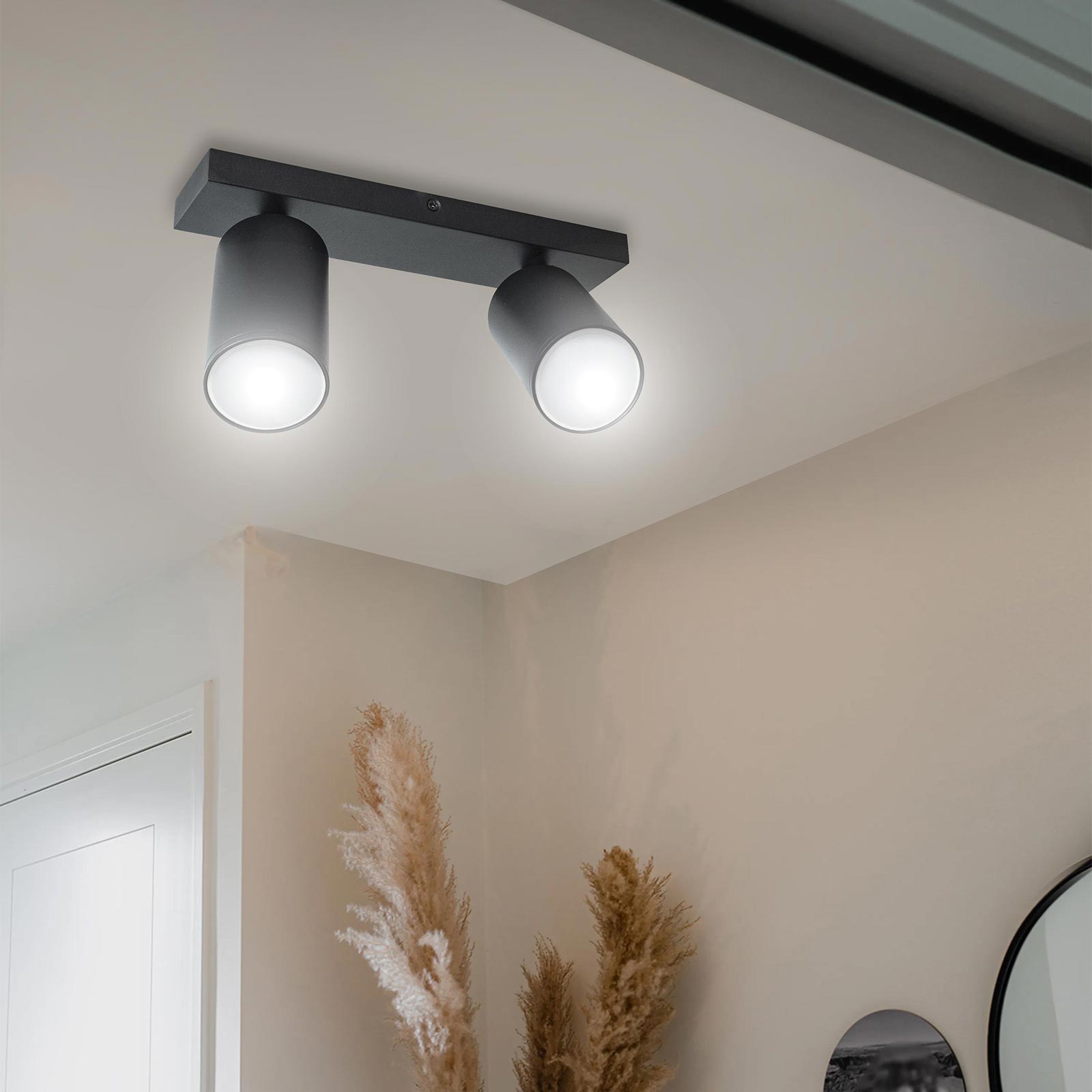 Plafoniera moderna realizzata in alluminio di forma rettangolare adatta per installazioni a soffitto o parete dotata di 2 faretti orientabili con lampada intercambiabile attacco GU10 ideale per l'illuminazione di ingressi, corridoi, cucine moderne, uffici, negozi, vetrine. Disponibile in 2 colori: bianco e nero per adattarsi meglio a tutti i tipi di arredamento.