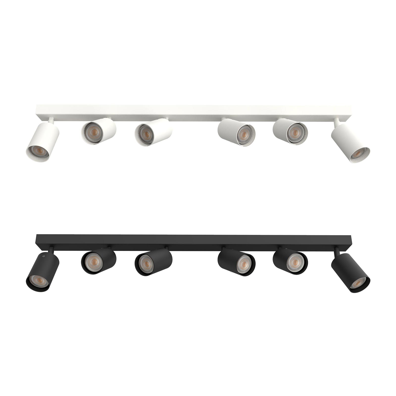 Plafoniera moderna realizzata in alluminio di forma rettangolare adatta per installazioni a soffitto o parete dotata di 6 faretti orientabili con lampada intercambiabile attacco GU10 ideale per l'illuminazione di ingressi, corridoi, cucine moderne, uffici, negozi, vetrine. Disponibile in 2 colori: bianco e nero per adattarsi meglio a tutti i tipi di arredamento.