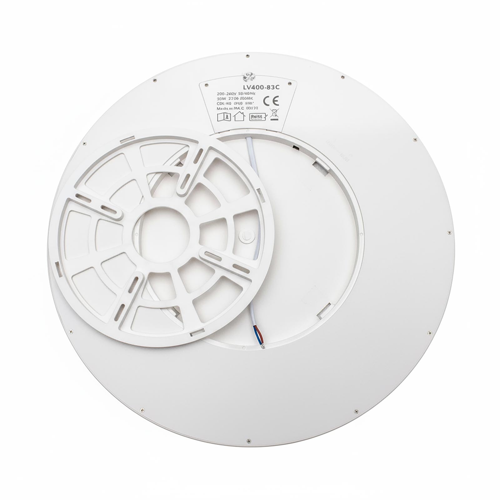 Dimensioni: diametro plafoniera 400mm, Spessore 24mm. Diametro base di fissaggio 225 mm.