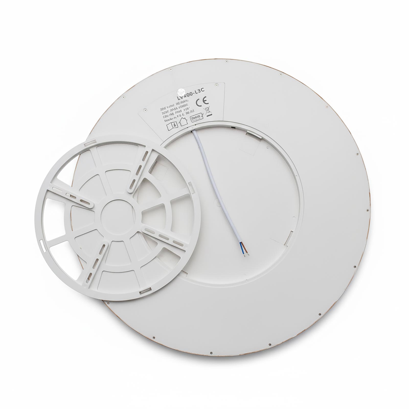 Dimensioni della plafoniera: Diametro Ø 400mm x 24mm di spessore. La base di fissaggio ha un diametro di Ø 225mm