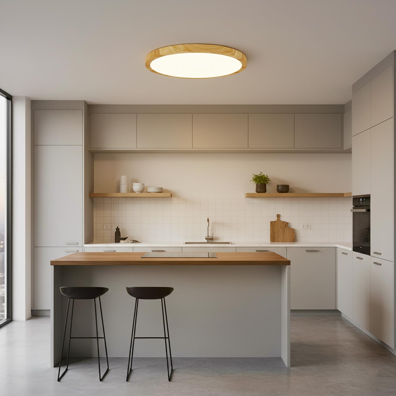 Elegante plafoniera effetto legno che unisce uno stile moderno e raffinato con un’illuminazione efficiente e uniforme, ideale per ambienti interni residenziali e professionali. Realizzata con corpo in ABS simil legno dalla forma rotonda integra un diffusore in policarbonato opalino che diffonde una luce morbida e piacevole, riducendo l’abbagliamento e valorizzando l’arredo con un tocco naturale. È adatta per soffitti e pareti di cucine, saloni, uffici, studi, negozi e spazi commerciali.