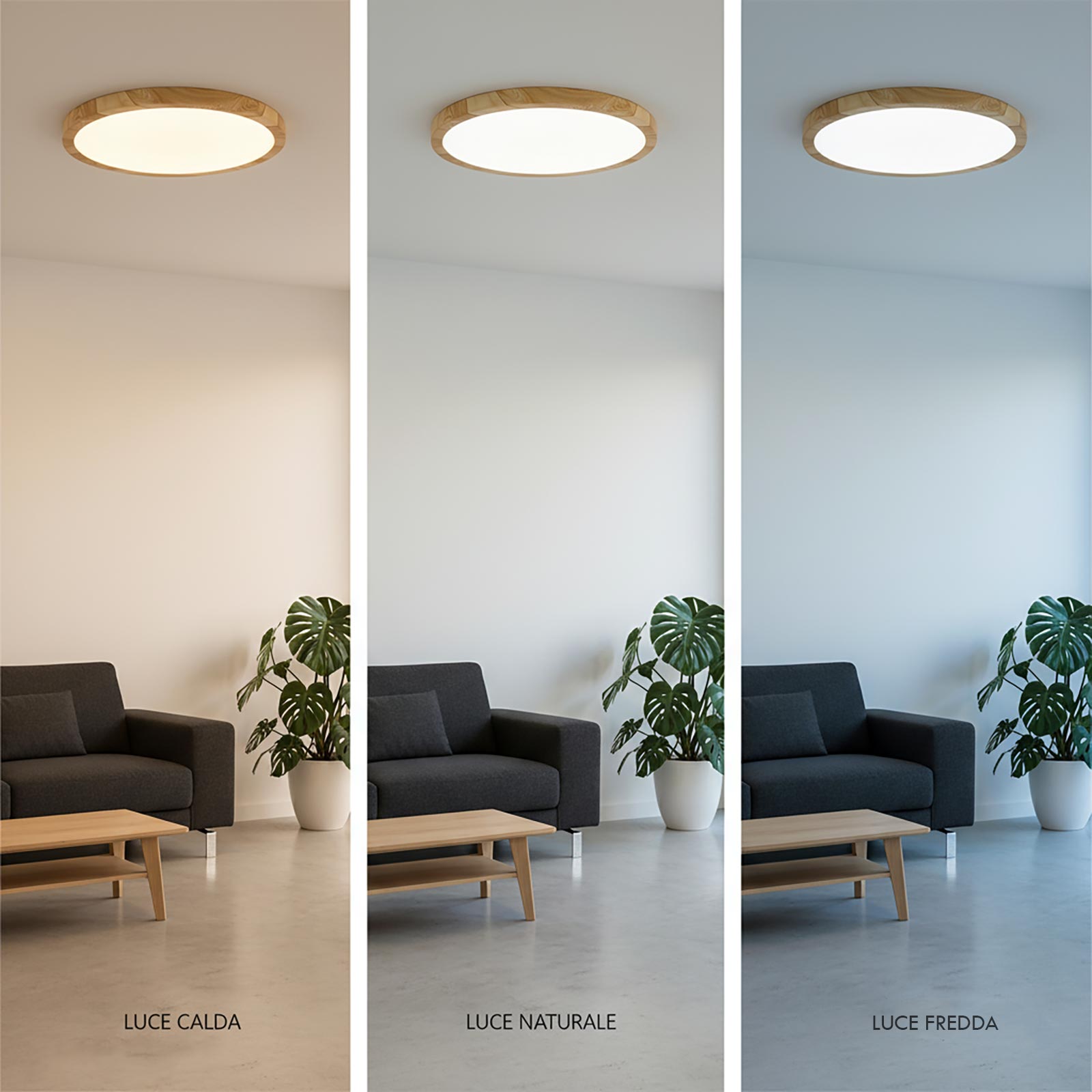 Elegante plafoniera effetto legno che unisce uno stile moderno e raffinato con un’illuminazione efficiente e uniforme, ideale per ambienti interni residenziali e professionali. Realizzata con corpo in ABS simil legno dalla forma rotonda integra un diffusore in policarbonato opalino che diffonde una luce morbida e piacevole, riducendo l’abbagliamento e valorizzando l’arredo con un tocco naturale. È adatta per soffitti e pareti di cucine, saloni, uffici, studi, negozi e spazi commerciali.