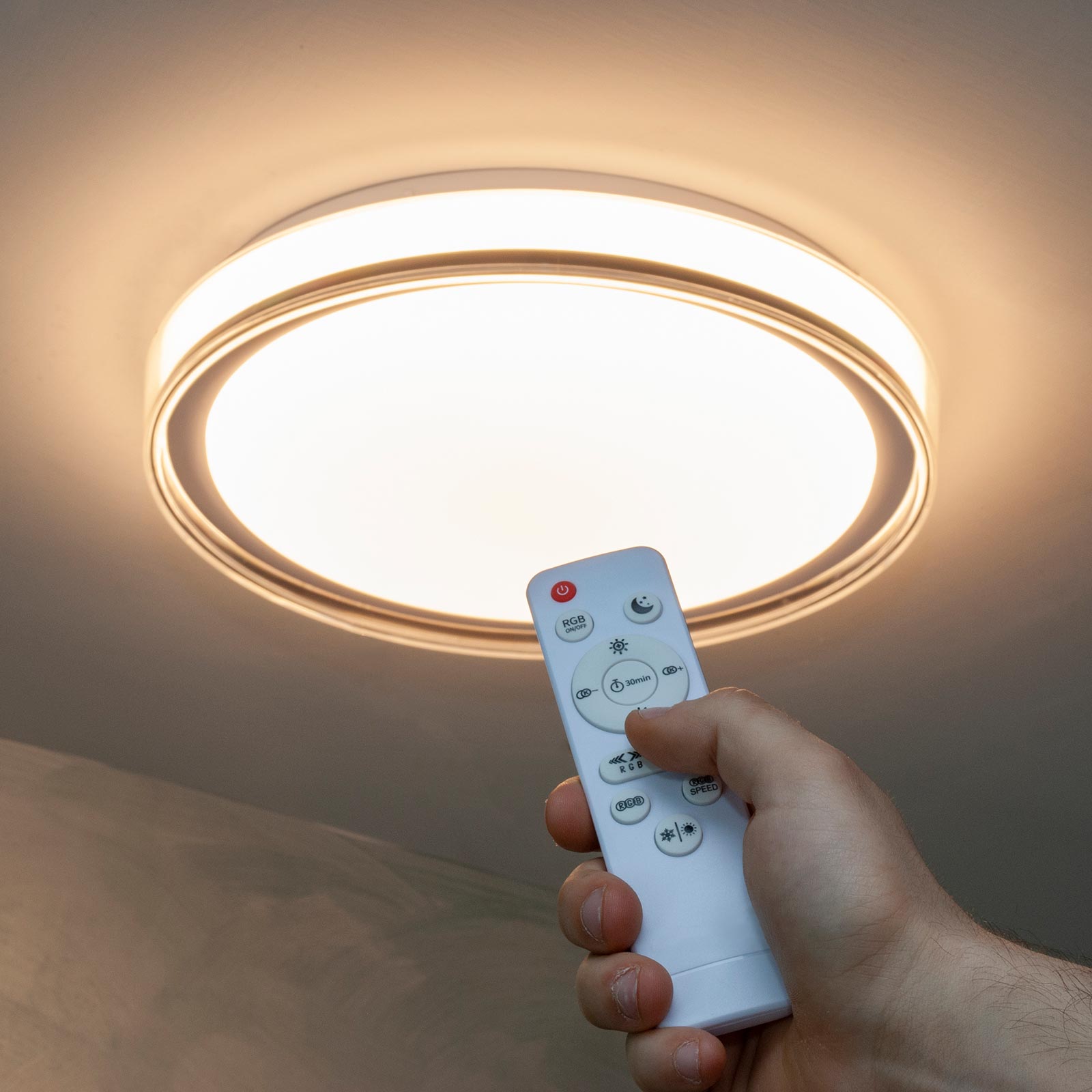 Tramite il telecomando possiamo cambiare colore, scegliendo quello desiderato, impostare un effetto di luce che cambia colore automaticamente, ed ancora grazie alla tecnologia CCT questa plafoniera è in grado di emettere anche luce bianca con possibilità di scegliere tra luce calda 3000K, luce naturale 4000K o luce fredda. Inoltre sempre tramite il telcomando possiamo aumentare o diminuire l'intensità luminosa o impostare un timer di spegnimento di 30 minuti.