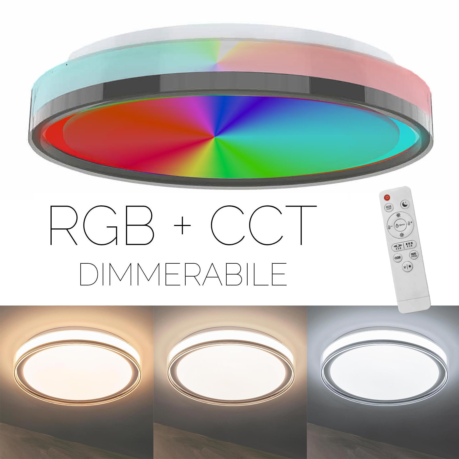 Tramite il telecomando possiamo cambiare colore, scegliendo quello desiderato, impostare un effetto di luce che cambia colore automaticamente, ed ancora grazie alla tecnologia CCT questa plafoniera è in grado di emettere anche luce bianca con possibilità di scegliere tra luce calda 3000K, luce naturale 4000K o luce fredda. Inoltre sempre tramite il telcomando possiamo aumentare o diminuire l'intensità luminosa o impostare un timer di spegnimento di 30 minuti.