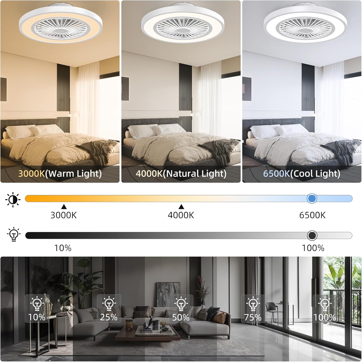 La plafoniera moderna LED CCT da 62W con ventilatore integrato è una soluzione versatile e intelligente per l'illuminazione e la ventilazione degli ambienti interni. Questo prodotto innovativo permette di variare la temperatura della luce da 3000K (bianco caldo) a 6500K (bianco freddo), adattandosi perfettamente a diverse esigenze e atmosfere. La plafoniera è dotata di un ventilatore integrato a 6 velocità, ideale per rinfrescare ed arieggiare gli ambienti mantenendo un design elegante e discreto.